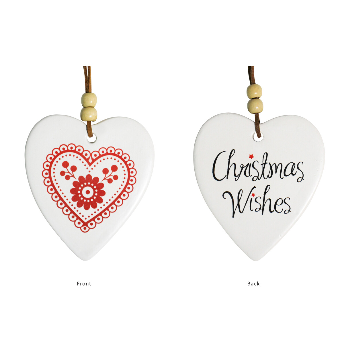 Hang Heart Christmas Folk Lace is perfection personified. This heart-shaped design is perfect for Christmas wishes. On one side there's a beautiful heart pattern in a red hue and on the flip side, written in bold script are lovely holiday words: 'Christmas Wishes'. This piece is expertly crafted from top-notch ceramic materials, giving it a luscious glossy finish that will grab attention wherever it is hung. This eye-catching and captivating ceramic piece can be hung on any door knob, the front porch or a wall to bring an added layer of whimsy, charm and enchantment into one's space. Plus, it has an inviting charm that will make the holidays more special while adding a cosy vibe throughout!