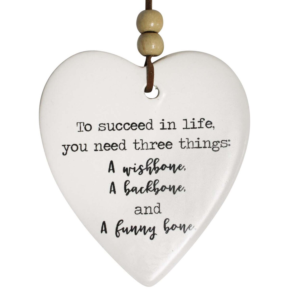 Embrace the charm of the Hang Heart Funny Bone, a heartwarming piece that blends inspiration with a touch of whimsy. Crafted from high-quality ceramic, this hand-finished creation bears the cozy dimensions of 8x9cm plus hanger, perfect for adding a personal touch to smaller spaces or complementing gallery walls in homes or offices. The heart's pure colour serves as a canvas for a poignant message that resonates with everyone: to succeed in life, one needs a wishbone, a backbone, and a funny bone. Despite or perhaps because of its delightful imperfections, each piece carries a distinct character, ensuring that no two hearts are exactly alike.