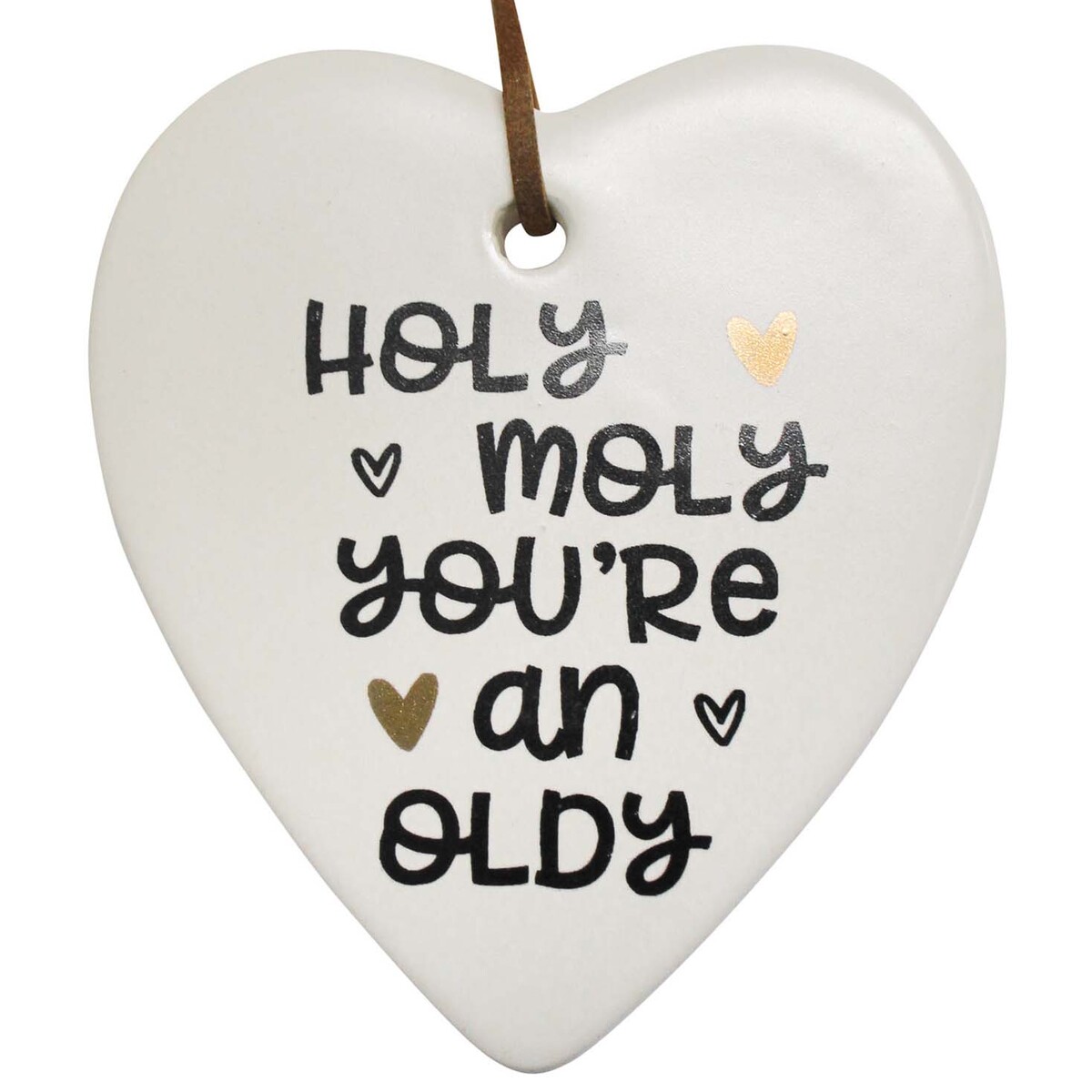 It’s a bit cheeky, but the ‘Holy Moly You’re An Oldy’ heart hanging is always good for a laugh - even if it is at someone else’s expense. Our Hang Heart Holy Moly sign fits perfectly in shops that love to celebrate ageing (with class and a dash of wit). It’s great for events and get togethers because it’s bound to get a few laughs. It comes in white with a black border and classic font. At 8x9cm + hanger, it’s not too big, but definitely not too small. It’s made from ceramic, so it’s hardwearing and sturdy. The leather hanger adds that little touch of individuality that each piece deserves. This little heart is all handcrafted and finished by hand. No two pieces will ever be the same - don’t be surprised if you see imperfections in the ceramic or printing. That’s what makes each piece unique!