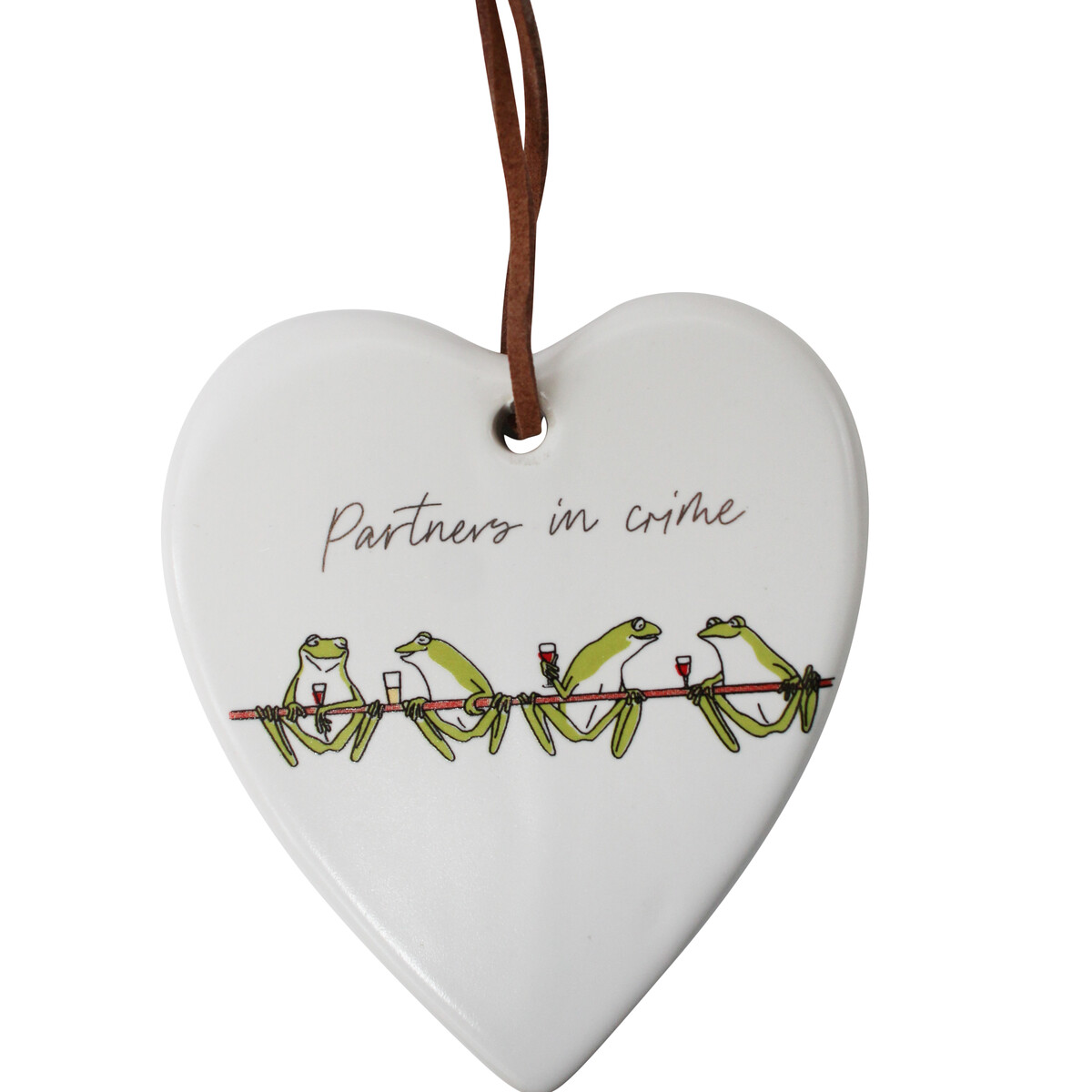 Crafted through the use of high grade ceramic material, the Hang Heart Partners in Crime expresses a popular cliché which applies to only best of friends. Written on the smooth surface of this decorative hanging heart are the words “partners in crime” and then further expressed via the image of two pairs of frogs having a great time together while drinking wine from a wine glass. These words, the colourful glazed image of frogs and the overall love shape of the ceramic heart makes it particularly perfect for gifting especially on such special occasions like the forthcoming Valentine’s Day.