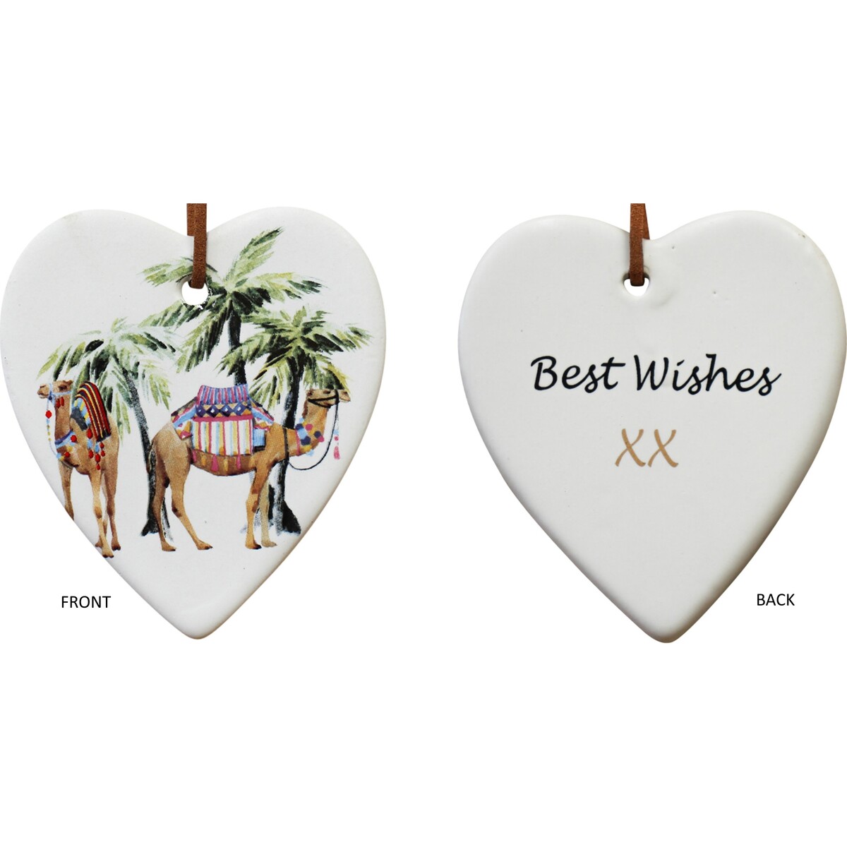 The very fact that ceramic has an earthy connection gives its origins and its handmade nature a lot more attractiveness. Created keeping in mind that sometimes one gives away little gifts like souvenirs so as to commemorate a day or event. For such occasions this little giveaway parry favour is perfect. The slotted ribbon does make it hangable - and the very fact that it is merely 9 cm tall with 8 cm width, it sure is pert and pretty and rather interesting graphics to back its good looks. The other side of the heart says-Best wishes-thus making it a versatile kind of choice for all kinds of occasions -of all attendees at any do-or for a birthday party favour-or simply to send out good wishes -along with gifts, you could simply pop in this little tag like giftable heart as well along with the rest of the paraphernalia.