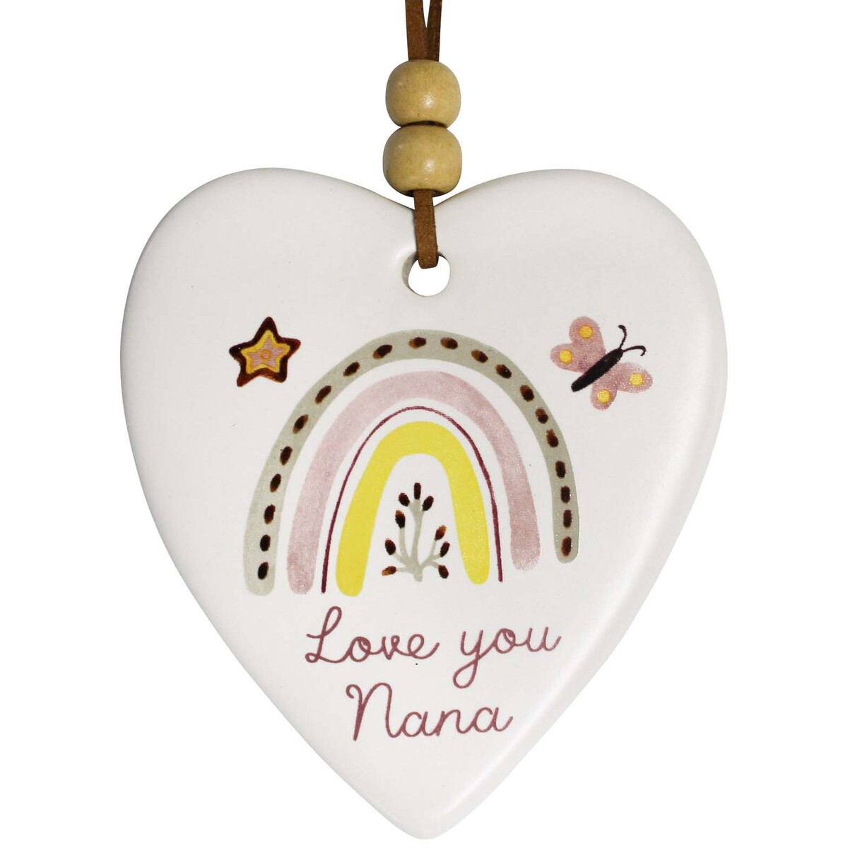Homeowners can add a burst of colour and love to their living space with Hang Heart Rainbow Love Nana. This beautiful ceramic hang heart features a vibrant and cheerful rainbow pattern that will instantly brighten up any wall or corner.