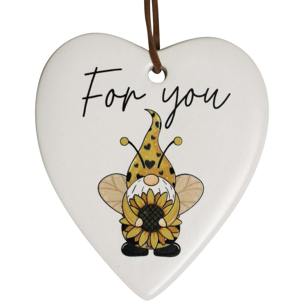 Hang Heart Sunflower Gnome is not only visually stunning but also brings a touch of whimsy and cheer to both indoor and outdoor decorations. Its auspicious design lends itself to creating an aesthetic flair that complements various decorative styles. Whether placed on a console table, mantlepiece, or window pane, this ceramic heart adds a subtle yet eye-catching element to any interior setting. Crafted exclusively from ceramics, Hang Heart Sunflower Gnome boasts excellent wear and tear resistance, ensuring its durability over time. It comes with a convenient hanging loop that easily fits over door knobs, allowing the ceramic heart to hang beautifully from the ceiling or other desired locations. Likewise, it can be used as an enchanting addition to Christmas trees, attached for fancy gift wrapping, or even used as bag tags.