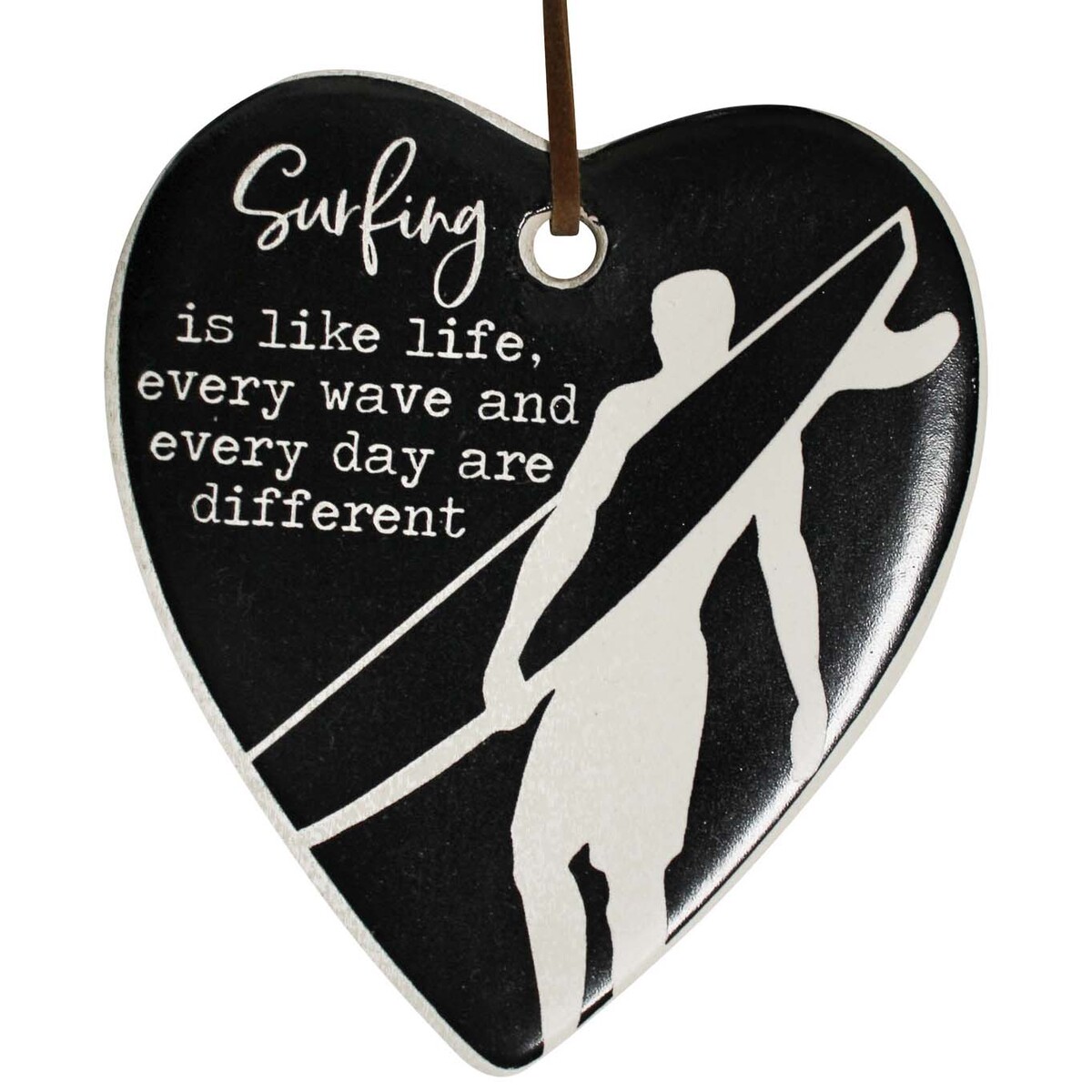 Our Hang Heart Surfing ceramic piece is a classic, quirky addition for your coastal, beach shack, or surf-loving customers. It's all about celebrating what we love about surfing - the unpredictable beauty and challenge of every single wave. The black-and-white silhouette design just works. It stands out in a good way - pops against almost any wall colour and fits right in whether your shop's aesthetic is relaxed, bold, or something in between. We especially love how much people appreciate the imperfect, handcrafted feel of these hearts – each one's got a bit of character.