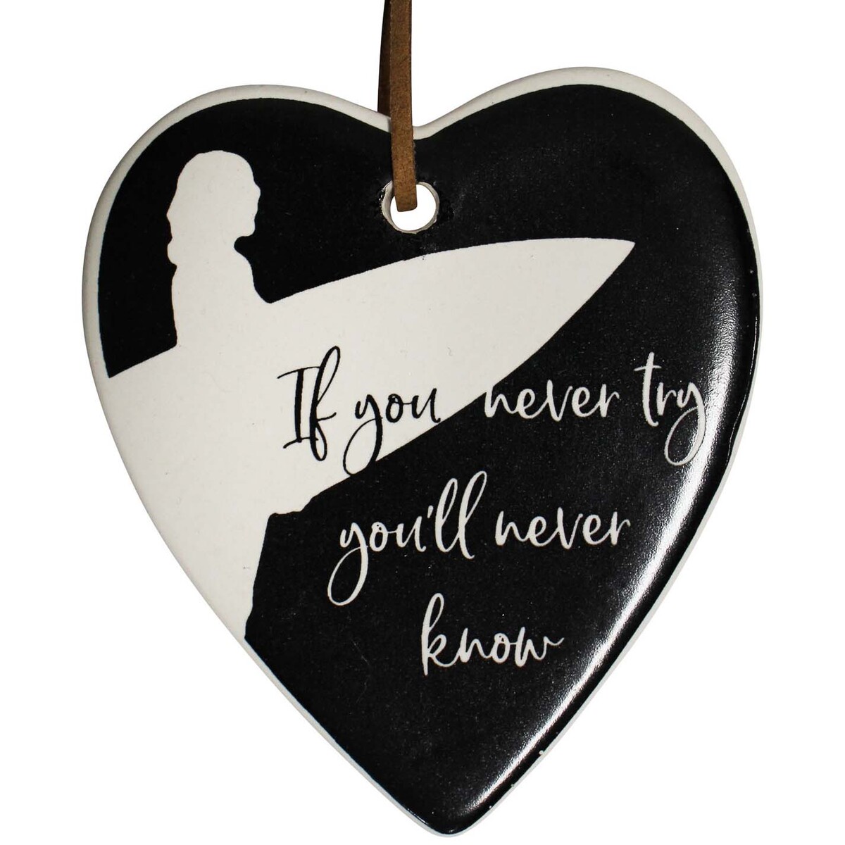 Our Hang Heart Try Surfing is a bit of a favourite here - there’s just something about its bold silhouette and that message. It’s not only a reminder to take on new challenges, but also quite a nice piece to add a little depth to any wall or small space. The black-and-white design, we think, is what really lets it fit in with so many different decor styles. That clean look against matte ceramic gives it an almost classic feel, but not at all boring. And we do want to point out these are handmade and finished - you’ll see little marks in the printing and ceramic itself sometimes, but for us that only makes each heart more interesting.