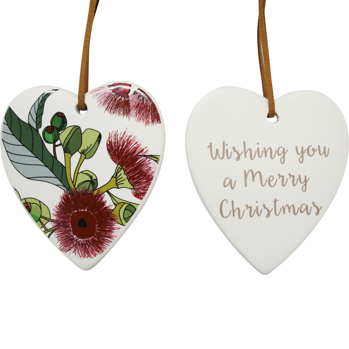 With each piece of this hanging heart being uniquely hand crafted using premium quality ceramic material, you can be rest assured of an enduring appeal and stately decorative appeal. Knowing full well that Christmas is never complete without giving and receiving gifts, this ceramic hanging heart is certain to become a consistently selling Christmas themed gift item. Beautifully decorating one of the two surfaces is the colourfully glazed image of gum flower while on the other side is the merry greeting of Christmas.
