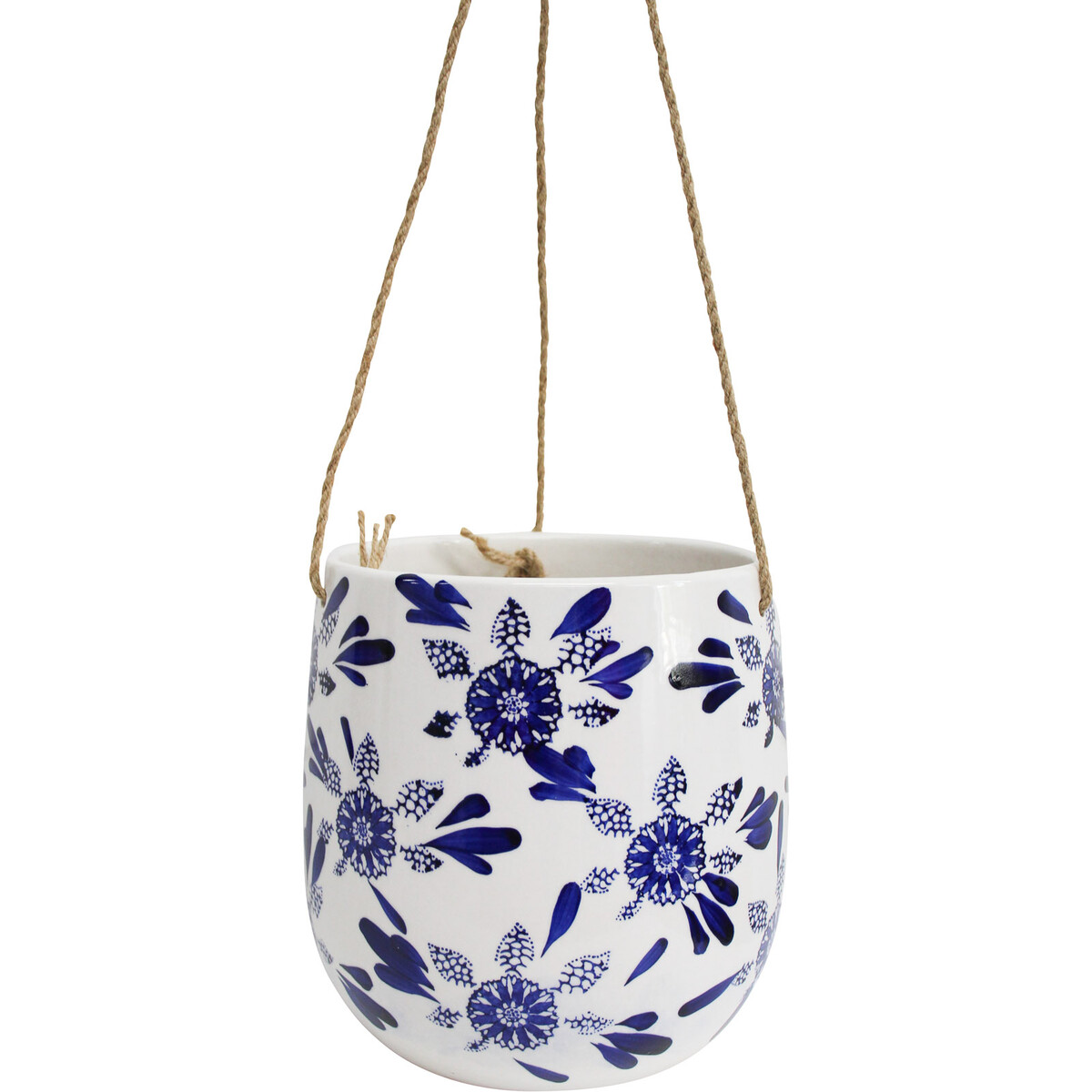 Suspended through the use of a rustic, all natural organic rope, the Hang Planter Blue and White offers your customers the irresistible display versatility of either placing it on flat/even surfaces like conventional planters or hanging it up in an innovative way to save floor space. Apart from its appealing versatile option, the planter itself has an intrinsic decorative value that would be perfect for heightening the overall décor of whichever spatial setting it is displayed. The exterior is adorably glazed with bright navy blue patterned ornamentation against the pristine white background.