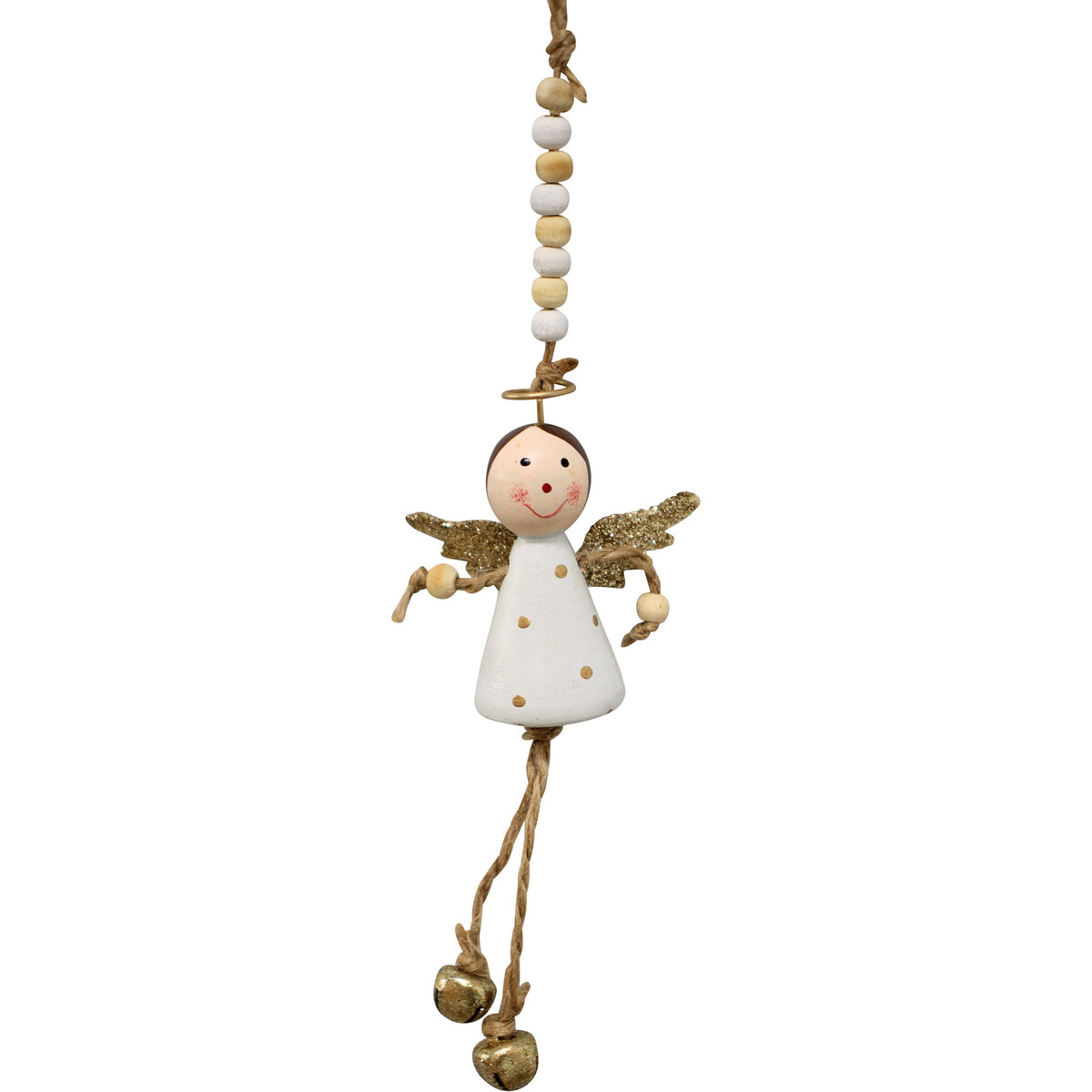 Made in a vertically oriented design which measures 11 centimetres in length and 3 centimetres in width, it is portable and suitable for use in all forms of Christmas decoration which your customers may have in mind for this forthcoming Christmas. This ornament features a female angel dressed in gown with gold sequined wings and stringed legs. The feet are made through the use of gold coloured Christmas bells. The two arms are also made of strings and beaded like wrists. On top of the head is the divine ring with a multi-coloured beaded string attached to it.