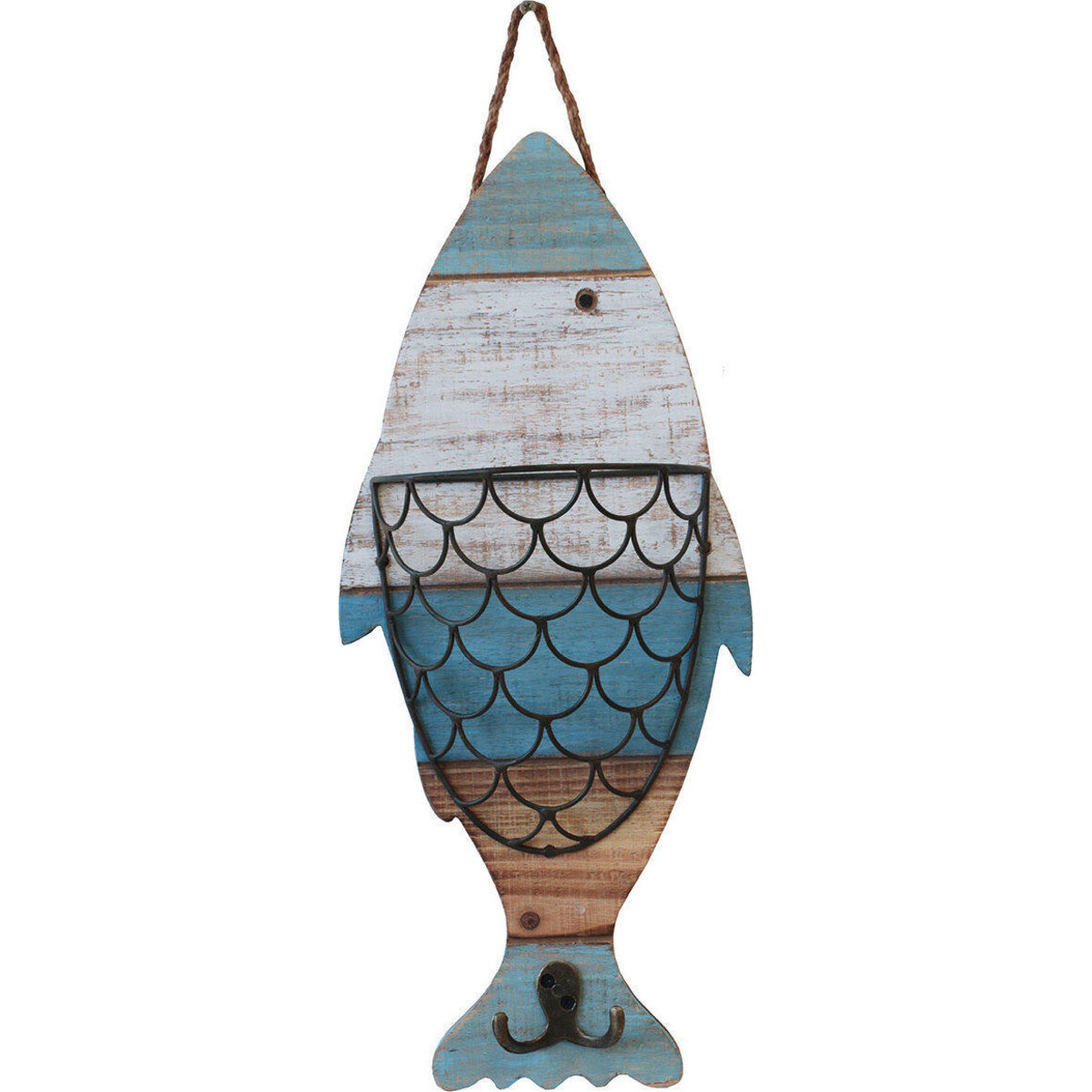 Make a statement with things that could be as much an accessory for your décor as they could be organizers in a general sense. This gorgeous wall placement has been shaped from weathered wood and coloured in such a way that it creates the impression of age and shabbiness. The fish shaped backdrop lends more resonance to the iron hooks that makes it such a useful placement on the wall. There is a forked hook that would be great for coats and umbrellas or even your scarf or muffler. And for things that you desire should no longer be in your pocket and could get lost in the crowd there is that basket that lends it ample space. The gorgeous fish with its blue, white and wood colours in shabbiest of colour tones makes for a rustic accent in the wall. The basket too is made of iron mesh and looks like fish scales. The entire piece is about 56 cm long and 22 cm wide with the ability to dominate the wall with its one of a kind look. Can be as great for the kitchen as it could be for the children's room where there is always need for that generic kind of pocket space like the basket here that could hold so many tiny possessions.