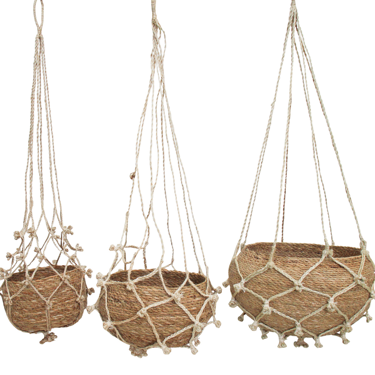 The Hanging Basket Patil S/3 showcases three baskets that are hand woven using only all - natural organic materials. The three baskets are all made through the artful weaving of carefully selected sea grass material. The provided ropes on the other hand, are made through the use of all - natural jute material. Both materials are environmentally friendly, mom - hazardous, non - toxic and biodegradable.