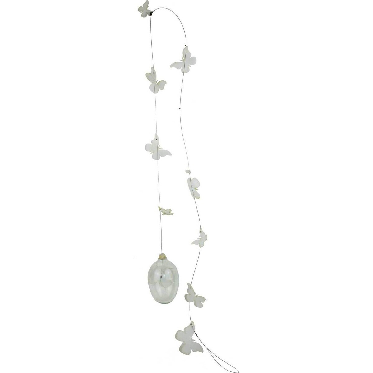 Hanging Bauble Butterfly is a special decorative item measuring 5x5x100 cm that comprises of bubble - shaped glass that is suspended on a string beautified with white butterflies at intermittent points. This product can form an exceptional object of art when utilized at the reception area for weddings, anniversary celebrations, birthday parties and other jovial occasions. The butterflies applied to enhance ornamental value work in magnificent style to make the glass device more prominent once set up in a particular venue. Buyers of Hanging Bauble Butterfly can employ a host of creative tactics to make look remarkable wherever they place it.