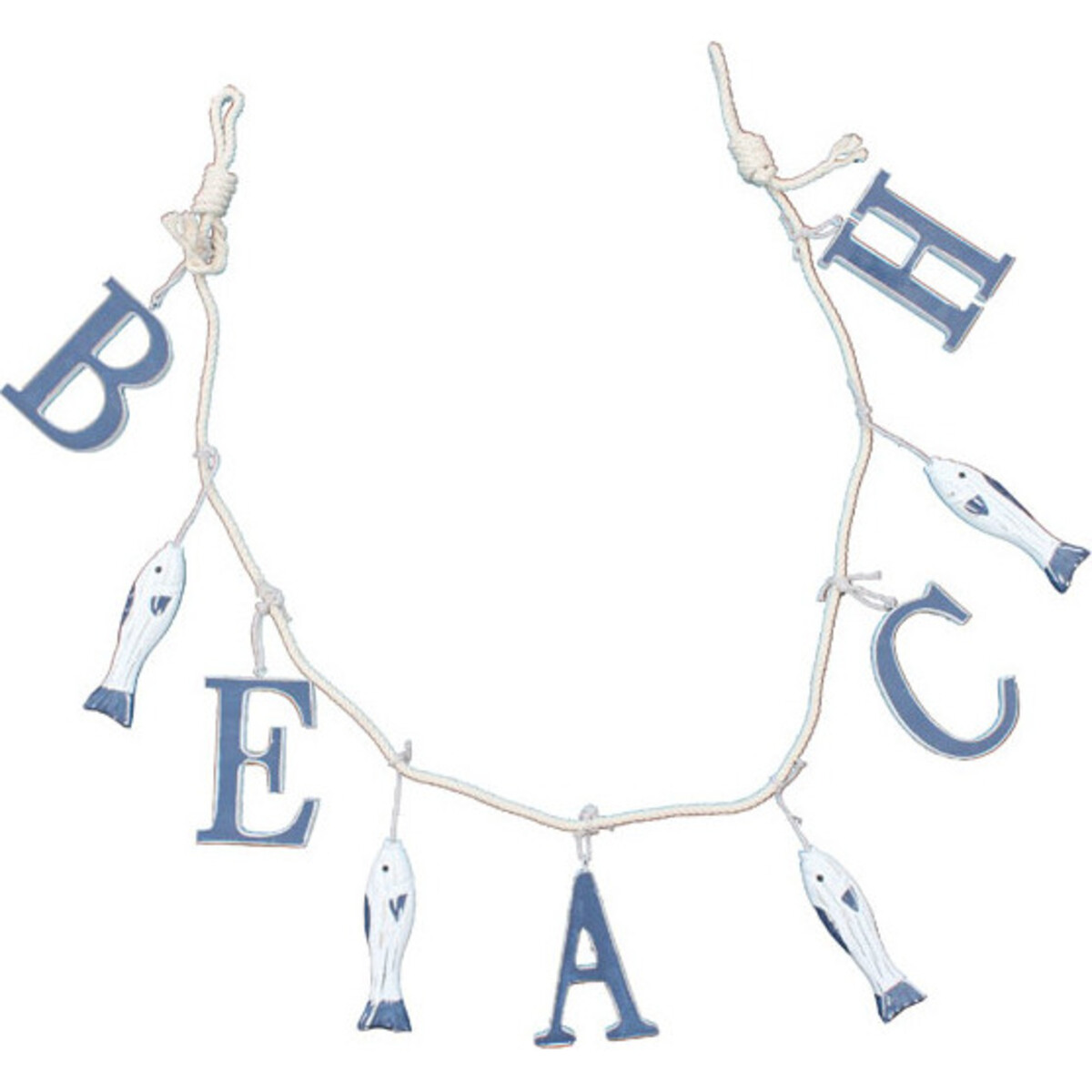 The design has the word "beach" spelled on it, with the letters of blue and white margins hanging on the main line through ropes. In between the letters though, are small fishes whose bodies are painted in white colours, with the tails and the fins painted with blue.
