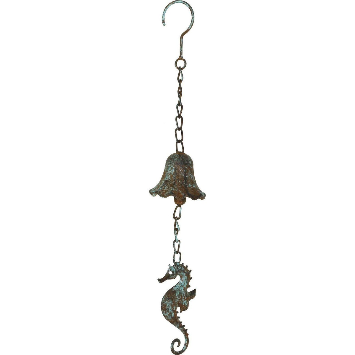 The handcrafted piece is endowed with the charm of a vintage appeal sand looks rugged and weathered as if it has been lying by the sea and the salt has left its mark on its surface. The shabbiness lends it a different kind of appeal making its aged appearance more of an antique feel carefully curated for a certain kind of look. The colour is a dull gray and blue that is really naturally weathered. |The tiny little bell with its beautiful seahorse lends a delicate charm to the space. The tinkling sound when the wind catches the bell's attention is soothing. Could be placed on doors to help you know if someone has just arrived or left. A piece that could be displayed at windows and the kind that will surely garner a great deal of attention because of its utterly shabby looks that modern homes love to wear. A hook right at the top allows easy hanging. The bell is all of 41 cm long and about 7 cm in width.