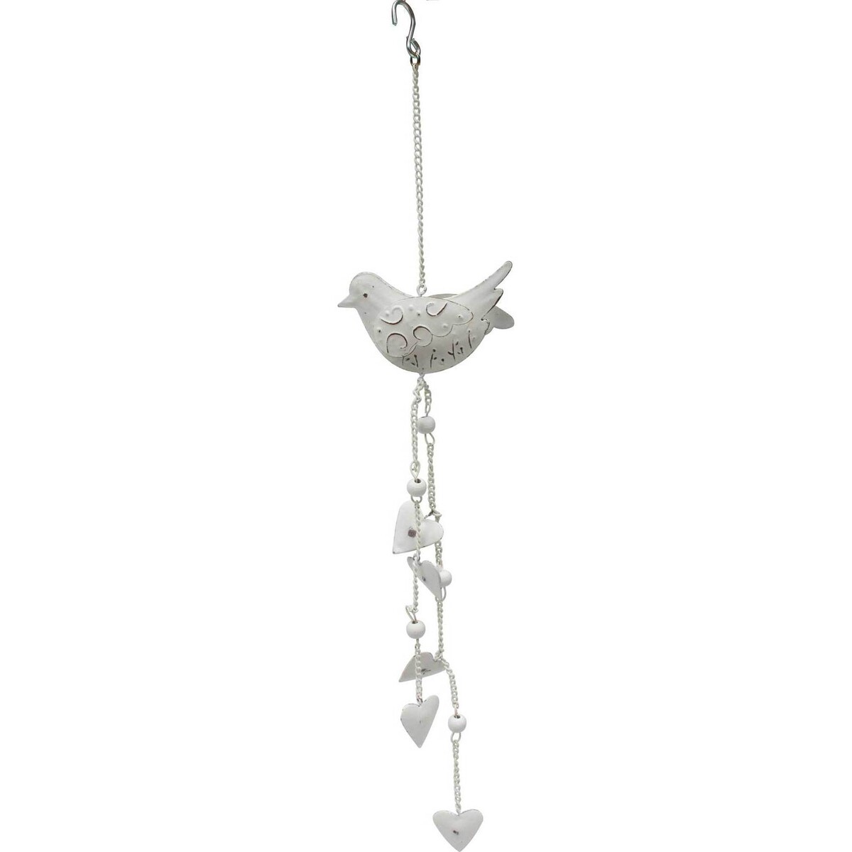 Whimsical hearts dangle from delicate chains in the Hanging Bird Dangle Hearts accessory from LaVida. A small metal bird is the centerpiece of this design and features embossed designs on its body. Long chains adorned with metal hearts and balls add visual interest. The entire hanging is coated in a distressed white finish with areas where the finish has worn away to expose the metal. A hook attached at the top makes for easy hanging in a window, doorway or from the ceiling of a breezy covered porch. This hanging measures 60 centimetres in length.