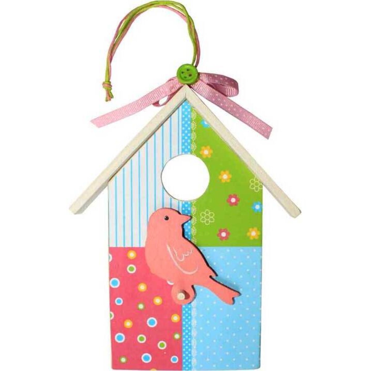 This light and brightly coloured adorable wall hang is a sure fire item to use to remind everyone that spring is right around the corner! Its bright and playful paint scheme will liven up any room and push the winter blues away. Hang it in direct sunlight to enhance the aesthetic. It features a playful wooden bird perched near the opening. The hanging birdhouse features four panels, and each of the four panels has a different colour and pattern, each one festive and reminiscent of spring. A pink ribbon crowns the peak of the roof, adding a lovely touch of feminine charm to an already eye catching piece. This item's cord is made of braided pink and green twine, a subtle accent that is sure to please the observer. A beautiful and highly unusual decorative item that has a fantastic handmade feel throughout that is also well sized and perfect for the home or garden.