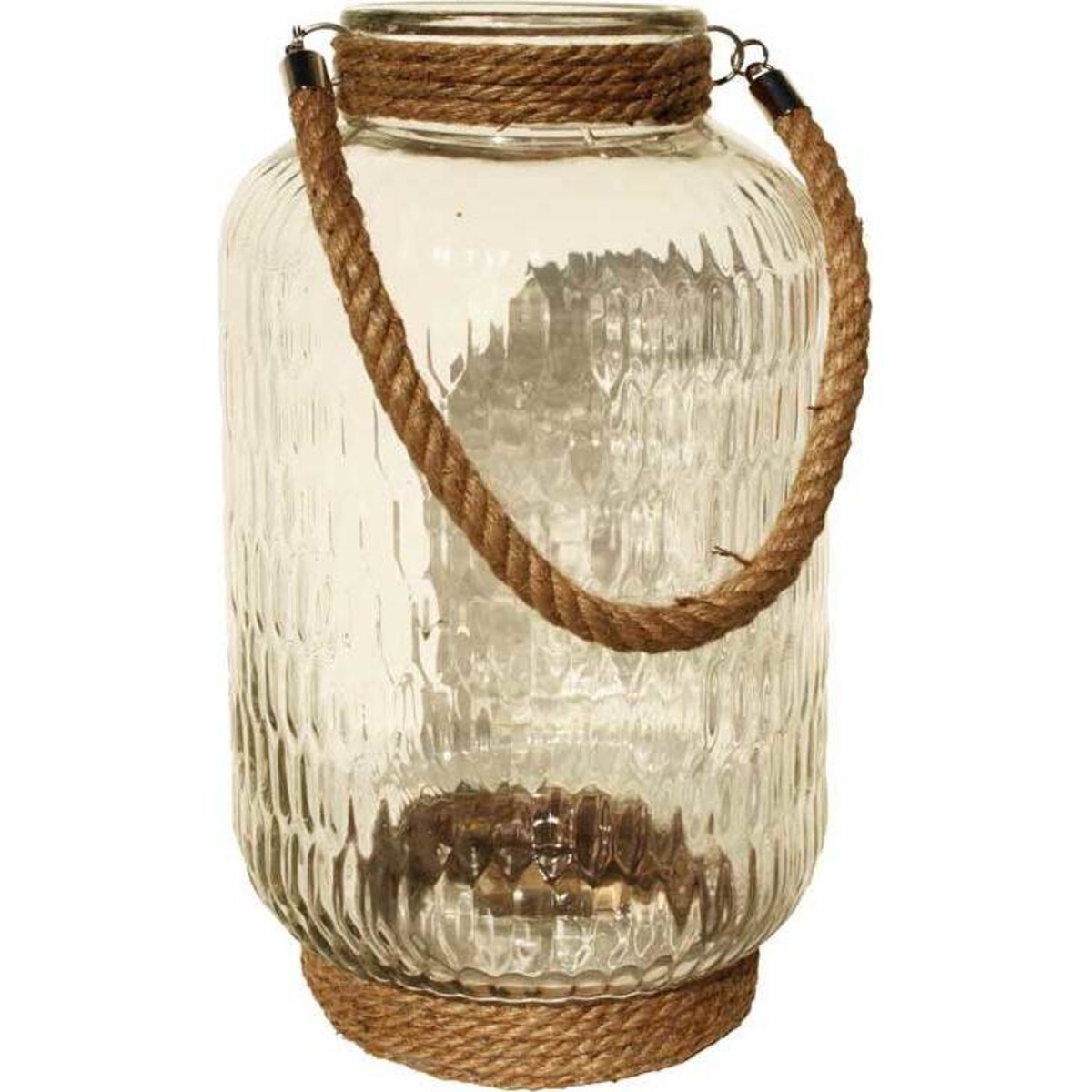 Textured glass and a hefty jute rope combine beautifully in the Hanging Bottle Costalo Tall from LaVida. Crafted in glass with a subtle dimpled pattern all over, this hanging bottle features a cylindrical shape that narrows at the top and bottom. Both ends of the bottle are accented with coils or rustic jute rope for a contrast in texture and appearance. A thick jute rope is fashioned into a handle so the bottle can be hung nearly anywhere. This bottle can be used to hold a tall pillar candle or filled with sand and seashells for a coastal - inspired accent.