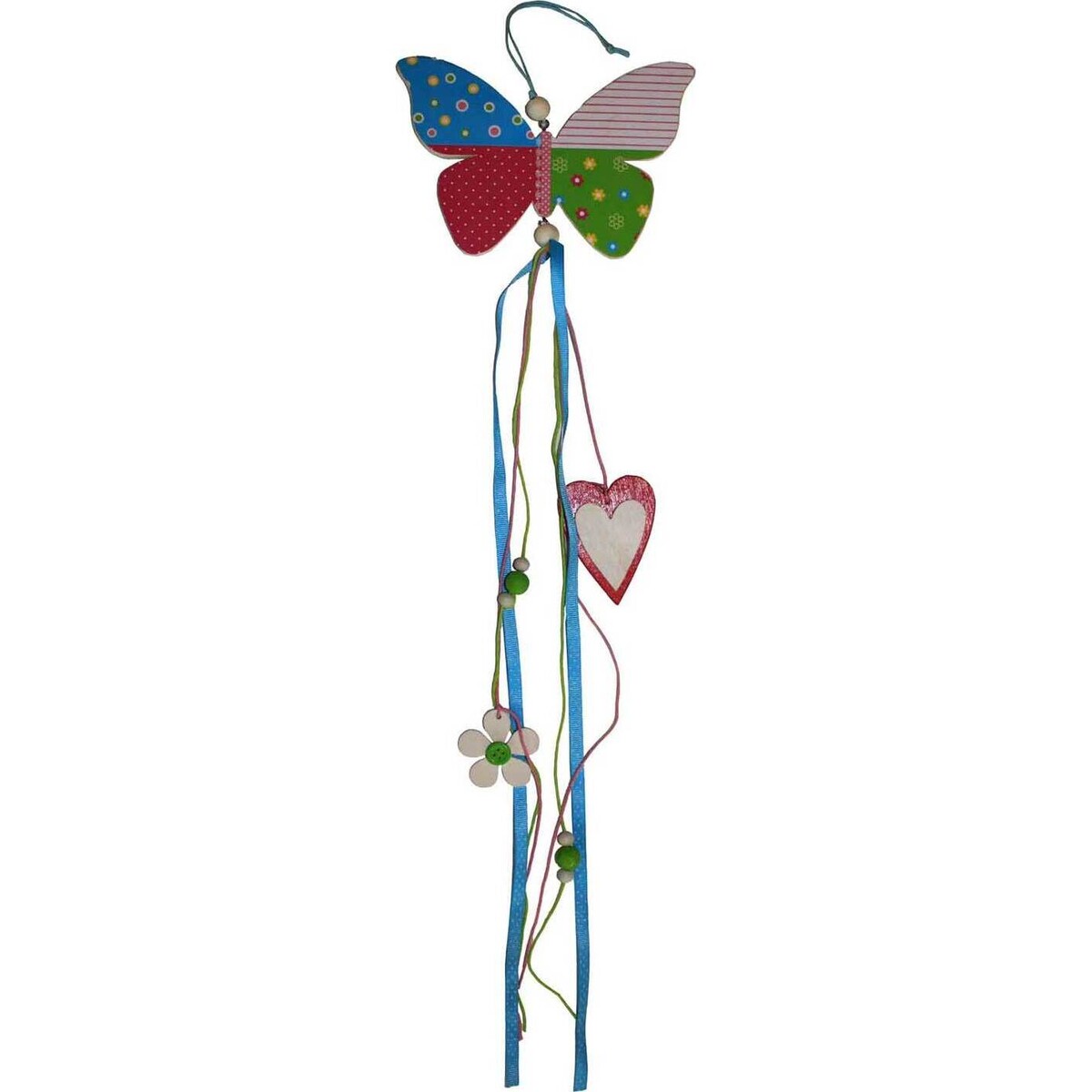 The hanging butterfly decoration is a beautiful item that can be hung both indoors and outdoors. The hanging butterfly is beautifully decorated with four distinct and eye catching patterns, including white and red stripes, a green floral pattern, a red and white spotted design and finally a blue and mixed colour spiral design. Each of these colours are bright and reminiscent of spring. Hanging from the butterfly are coloured ribbons and decorations held together by twine. The ribbons are a beautiful sky blue, while the twine is green and red. Hanging from the twine are beads, a button flower and an attractive wooden heart. The hanging butterfly is an attractive alternative to a wind chime, and the lack of any bells will ensure that this is a much quieter alternative, making it ideal for indoor as well as outdoor use. An aesthetically pleasing and highly unusual decorative item that children and adults will adore.
