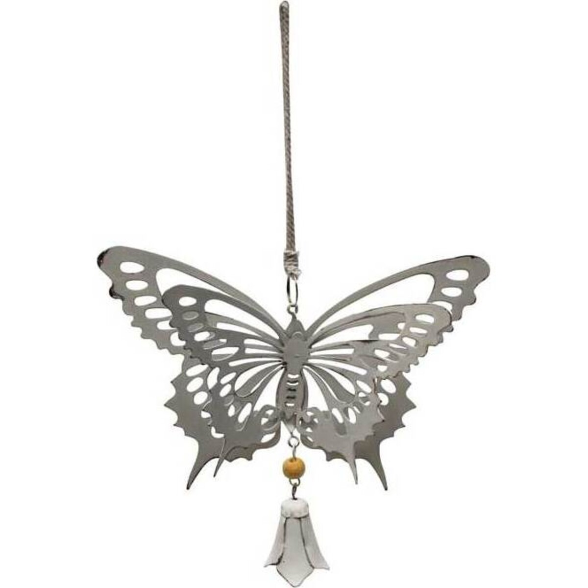 Cutout details create a feel of airiness in LaVida's Hanging Butterfly Shion Large. This butterfly is crafted from two sheets of metal layered together for a three - dimensional appearance. A bell - shaped flower, also created from thin metal, hangs from the bottom of the butterfly. This accent piece is finished with a coating of distressed white paint, with some areas of exposed metal for an antique look. The hanging includes a white rope loop for convenient hanging. This butterfly is the larger of two in LaVida's collection and can be hung alone or in pairs or even groups.