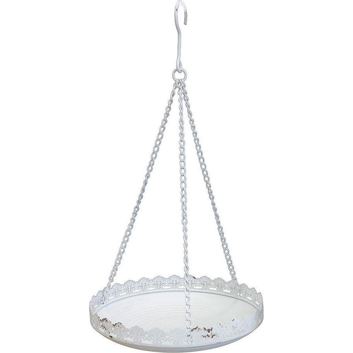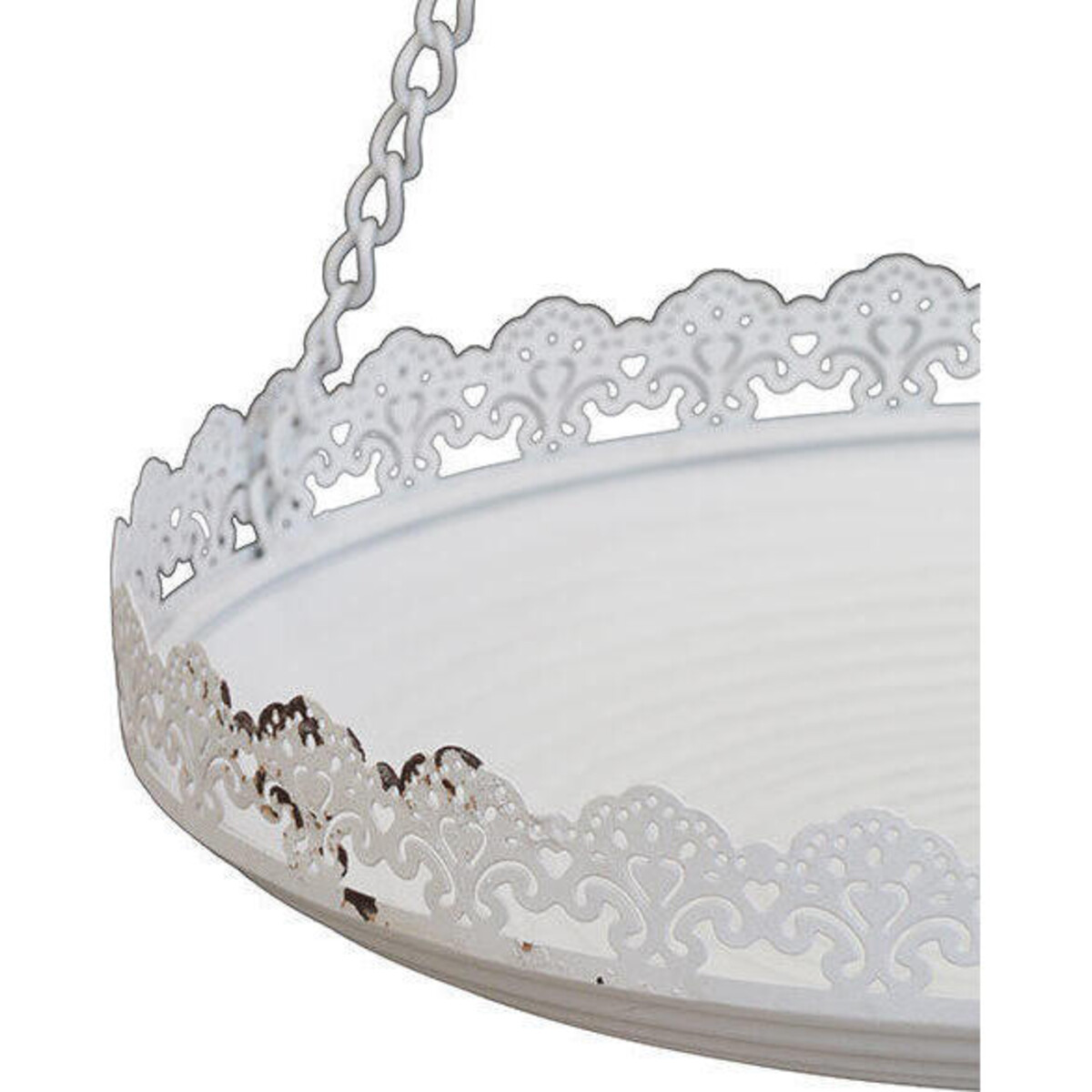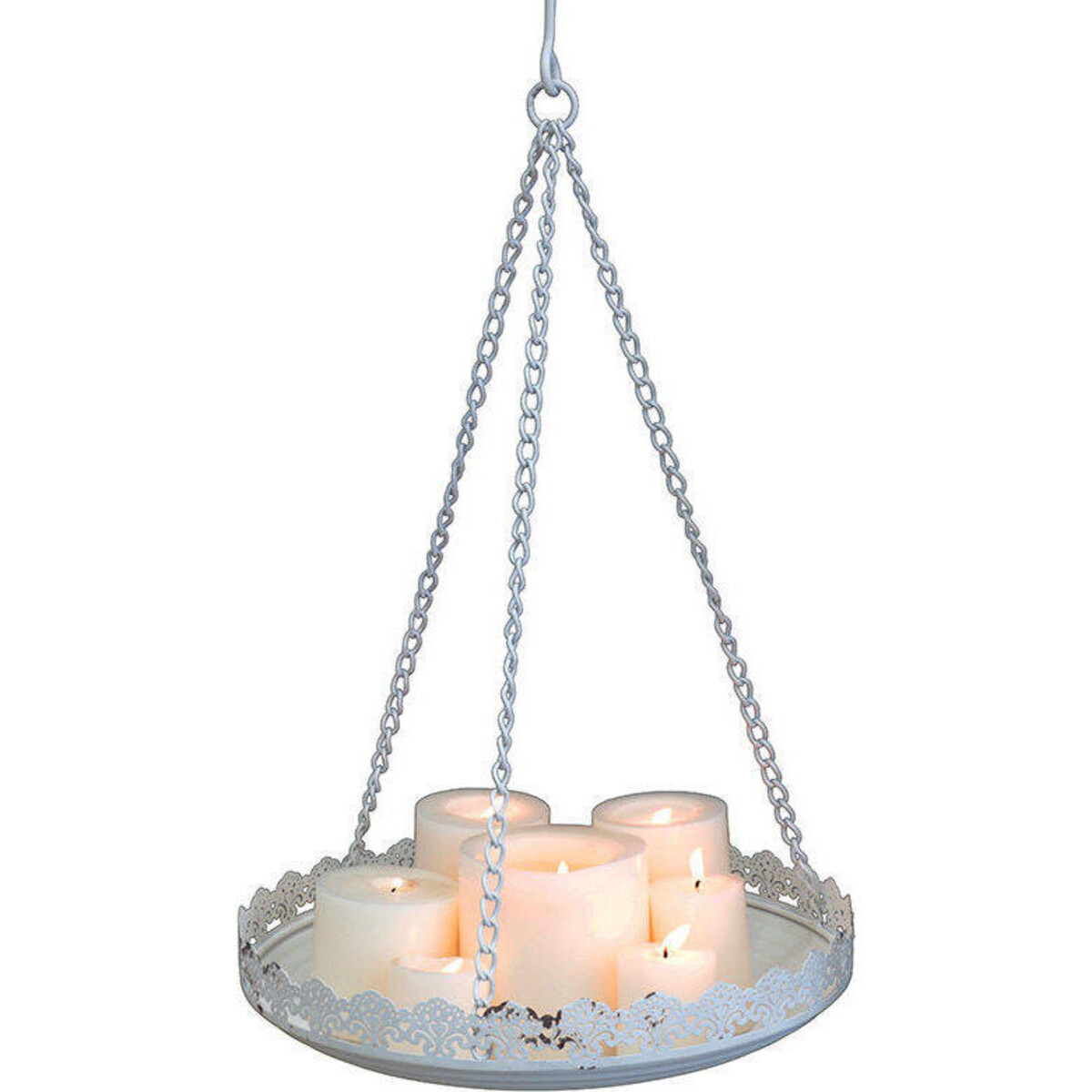 The creation of ambiance in your interiors depends a great deal on the kind of lighting you opt for and what could be more sift and soothing allowing all of your décor t look their best, than candle light. While we struggle to create space for chunky candles on consoles and table tops, we fear the worst - wax spills and toppling - why not cast aside all of these worries and give these candles vantage space on top with the help of this hanging platform that could hold several small and big sized pillar lights? The diameter of the metal plate is 32 cm and it has a depth of 7 cm with a gorgeous filigree frill like edging lending it a vintage appeal. The white coloured distressed paint effect too helps create a look of a vintage setting. The hanging candle holder comes with its chain attachment which should allow you to hang it in corner or even above the dining table or any other seating where you wish to create this kind of ambient look.
