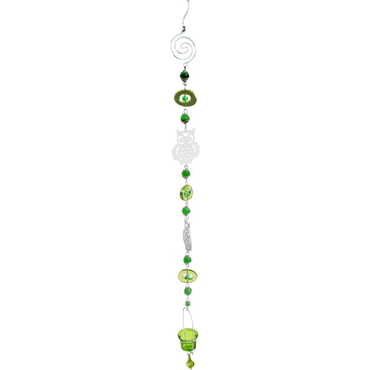 Introducing the Hanging Owl Candleholder from Lavida. This green and silver themed vertically hanging piece consists of two filigree owls and multiple green beads that are connected together. At the end is a green candleholder in which you can put a tealight or a votive. Thanks to the hook at the top, you can easily hang this decorative accent from almost anywhere. Put it on your porch or in any room of your home and it's going to add a bright burst of colour you can't help but adore.