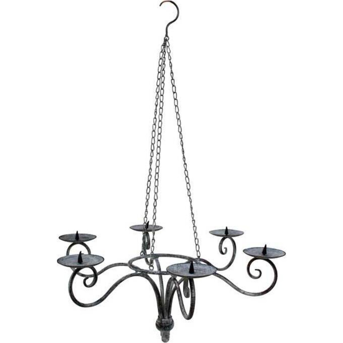 For centuries, chandeliers relied on candles, rather than electricity, to provide light. This Hanging Candleholder Umbria from LaVida serves both as a reminder of those times and a way to achieve romantic candlelight overhead. This hanging candleholder has spiked holders for six candles. Scrolled metal arms hold up each candle and are joined together at the base. The entire piece is suspended from three slender chains attached to a hook for easy hanging. This candleholder is coated in a distressed, grey painted finish with areas of exposed metal for true vintage styling and a timeworn appeal.