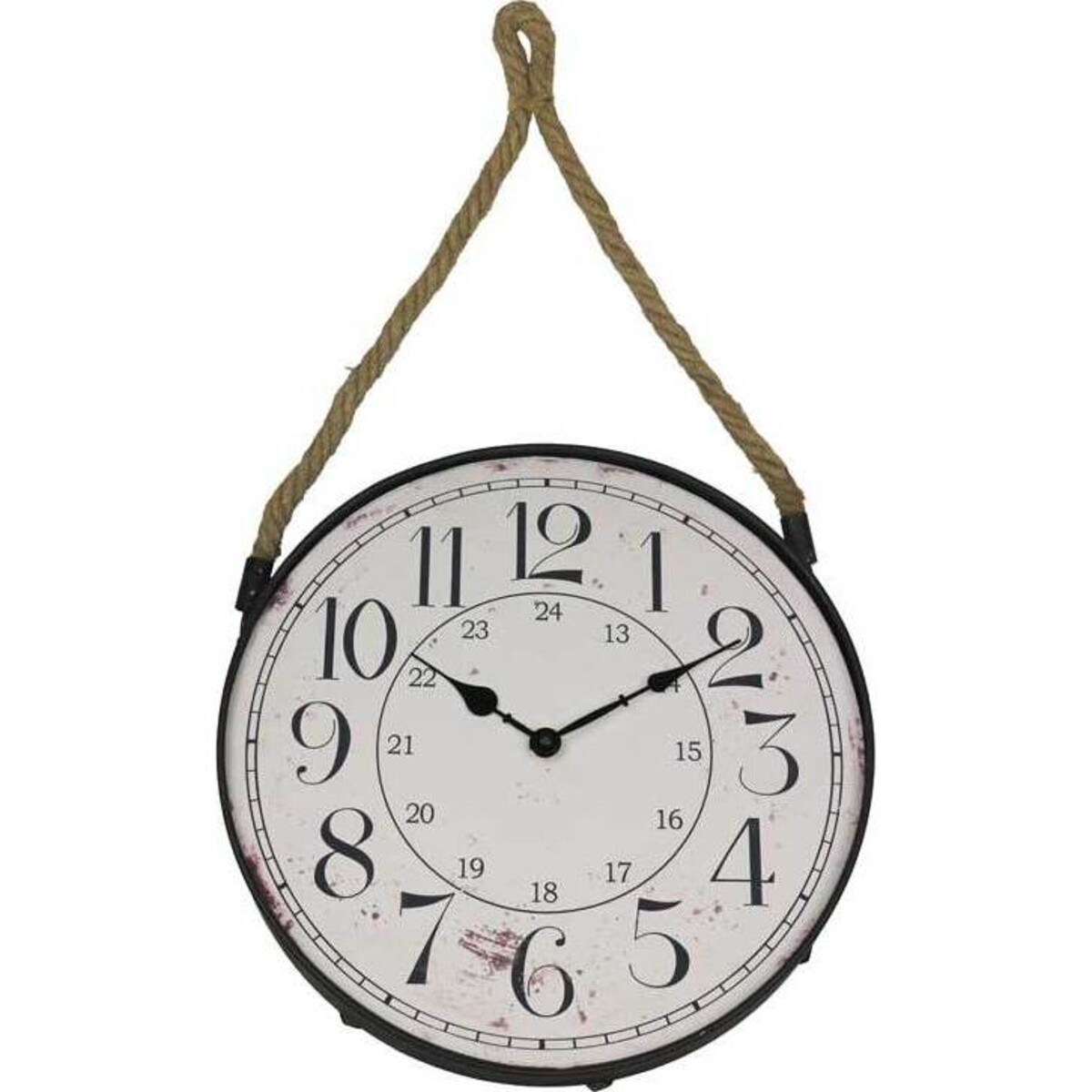These fabulous clocks are comprised of metal but feature a rope loop at the top to allow for easy hanging. The white face has over-sized black numbers and black hands so you can easily see the time from wherever you are in the room. The clocks are strategically worn to give them a vintage feel as if they've been used for quite awhile and come with a story to tell. They're a fantastic addition to any room of your home whether you hang them in the bathroom, the living room, or any other room in between.