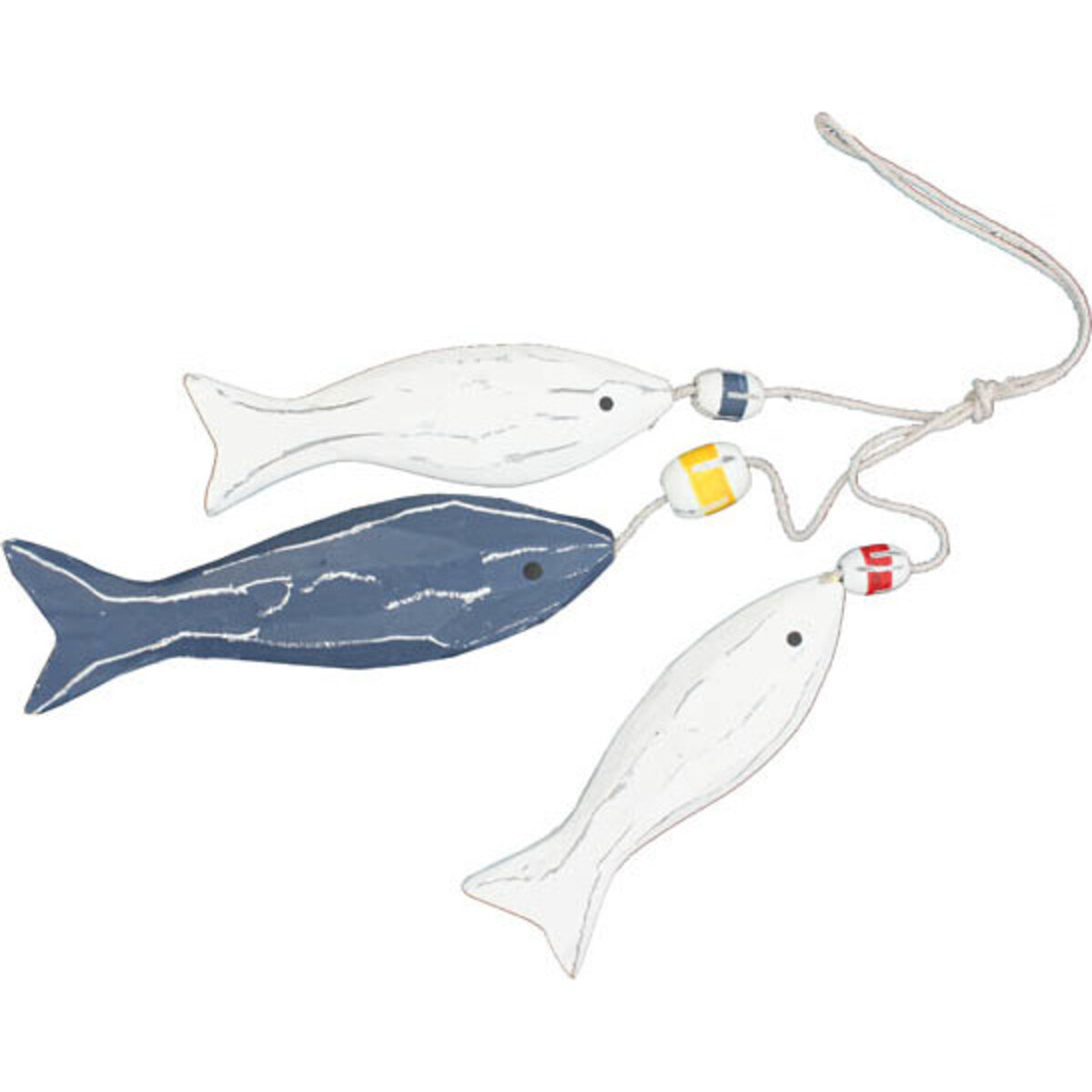 Anyone who has a collection of fish miniatures and pictures will surely love the rural ambience of the seaside that the Hanging Fish - Tripple Bouys can offer. It is of a simple design that will surely work well and look great as a display in beach themed houses or seaside establishments like cafes and resorts. The item shows three large fish that seemingly have bitten the bait and is now hanging at the end of a fisherman's line. Two of the fish are of a simple white colour, with blue streaks that add a bit of colour to both fish. The third fish is of a dark blue colour, and has white streaks on its side right to the tail. The fish are biting the ends of three different lines, with each line having one bouy of red and yellow for an added colour to the whole item.