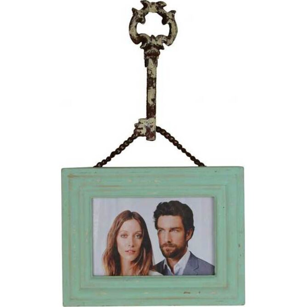 Pictures capture moments of time and what could be relegated to faint memories come alive when we see it. Similarly with picture frames that look special and have a personality of its own the pictures held within gain more character and look all the more special. In the case of this frame, the shape of the ornate key and the chain from which hangs the teal coloured frame with its peeling paint makes the picture look positively more romantic and worth a second look. Special attention has been paid to the look of the metal elements éwhile they may look vintage they are not crumby in fact they are treated to provide years of usage. The key and the hanging chain look all the more impressive and get highlighted further because of the distressed paint look of the frame. The frame is 36 cm in width and about 21 cm in height and can hold a reasonably large family picture or portrait.