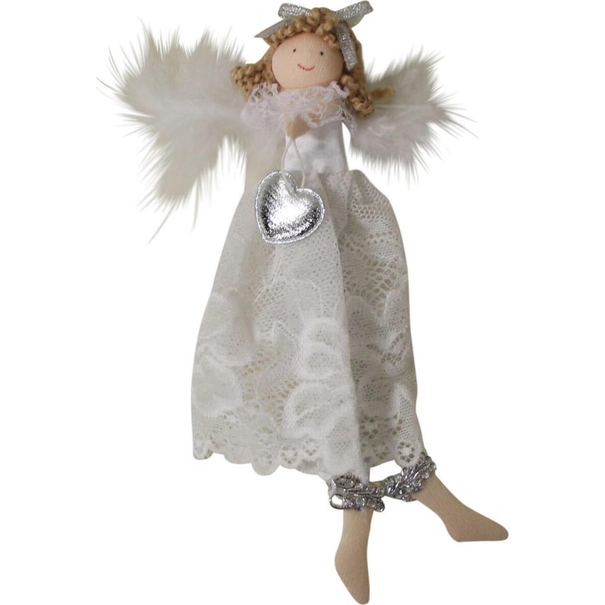 She seems to be carrying a message of love - the silver heart she holds in her tiny hands indicative of this message - a beautiful creature that seems to have descended from the heaven , she has a cherubic face that looks adorable - her white dress, much like that of a fairy and her cheery face bound to lend your home the look of festivities.