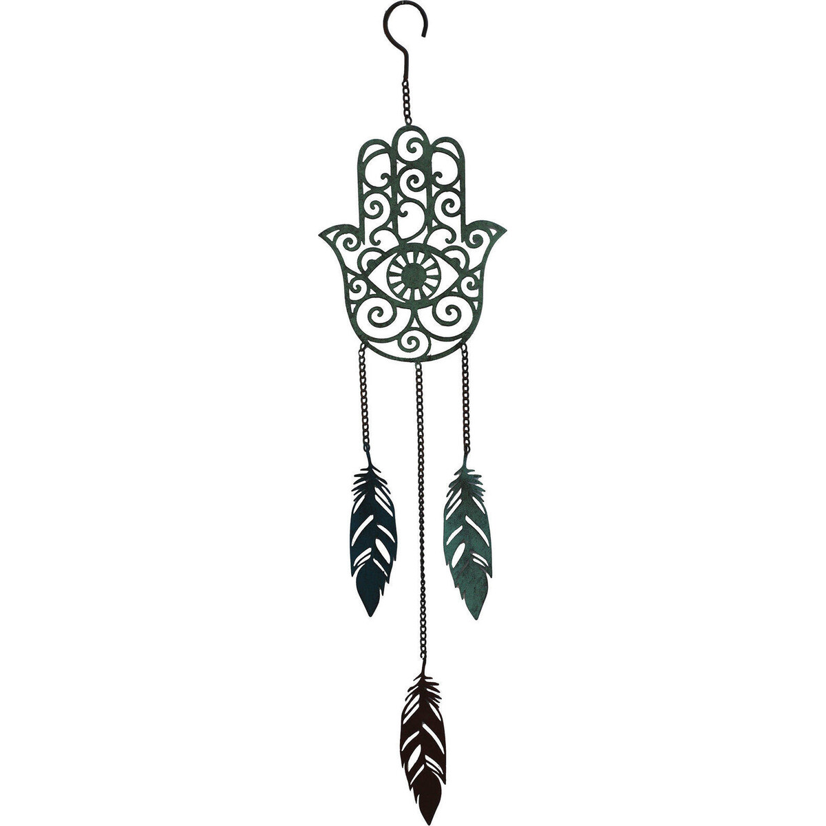 The hand of Hamsa or the Hand of Miriam is a popular symbol in North Africa Algeria common to Islamic, Jewish and Christian faith, finding its way into symbolism of several ancient religions - but above all it's a symbol of positive confluences of energy bringing in just the right kind of spiritual vibrations into your interiors. This hangable accent has been created from metal and features not just the eye embedded traditional Hamsa hand but also several feathers that give your good thoughts and positive ideas a certain lift and life. The swirls of pattern that makes up the hand itself with its two symmetrical thumbs and the inner eye is followed by three feathers in varied colours that lends the hangable beauty so much charm. There is a length of 70 cm from the hook attached to the top to the bottom feather. Can be placed like any other chime at the window or could be placed at the entrance of your home to build in that oriental appeal. The rustic metal embellishment has a superb looking design balance that appeals as much to a contemporary setting as it would to a home wanting to make itself appear more mid - eastern.