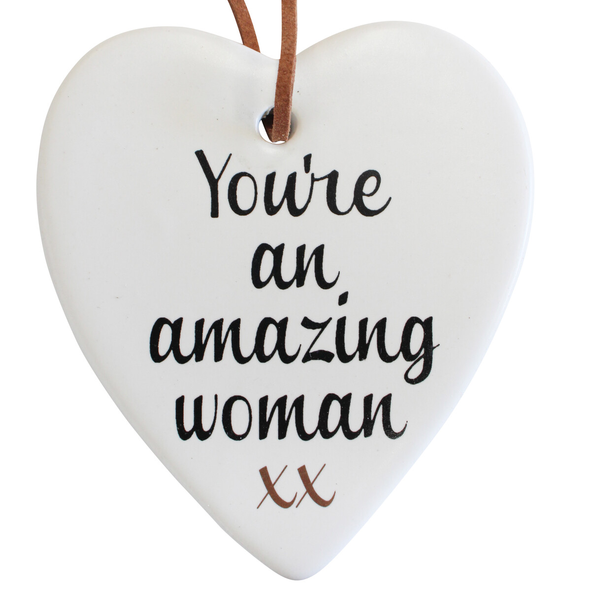 Made entirely from premium quality ceramic, the heart-shaped piece is varnished with a gloss varnish and embellished with its eclectic accent hanging loop. It also comes with a personalized message to that woman who holds incredible strength or strong and brave and inspires an entire generation of women. This ceramic heart is handy to decorate one's interior or simply used as a centrepiece. It makes an enthusiastic display of elegance and beauty. Needless to say, the durability and resilience of ceramic to tear and wear makes it a top choice for crafting this ceramic ornament. Use this as a beautiful addition to wrapped gifts.