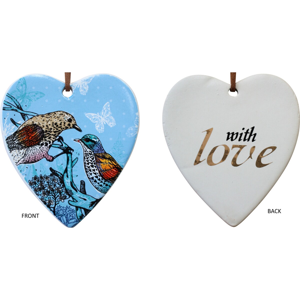 Hanging Heart Aqua 2 Bird has a precision finish, a long-lasting heart for a heartfelt message to best friends. This ceramic beauty exemplifies friendship and socializing. Friendship is a powerful emotion. It inspires true happiness and a unique bond. This is an ideal gift for that special somebody. It conveys all of one's enthusiasm and excitement. It has a charming outlook. It comes with a deluxe ribbon for good and decorative purposes. The beauty of this product is in its handcrafted Nature. It has a glossed coat, so it does not necessitate day to day upkeep. It is also durable to be used for outdoor scenery, in one's gazebo or front porch. Its pastel aqua colour radiates energy and spreads beauty all over the place.