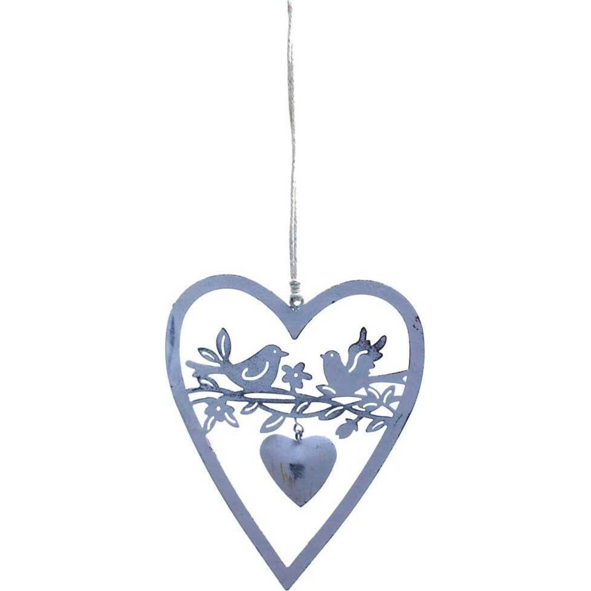 Hanging Heart Doves Lg' is an amazing sign crafted out of metal and with the dimensions of 12 by 9cm. Perched on a branch of kind which joins the heart from two points left and right of the heart's interior, two birds gaze into each other with keenness. A smaller heart has been suspended right at the middle of branch, which conveys a deep sense of connection between the two birds. A beige hook extends from the top centre part on the exterior reaching upwards. An observer notices with ease the strong symbolism of mutual appreciation present in this artefact.