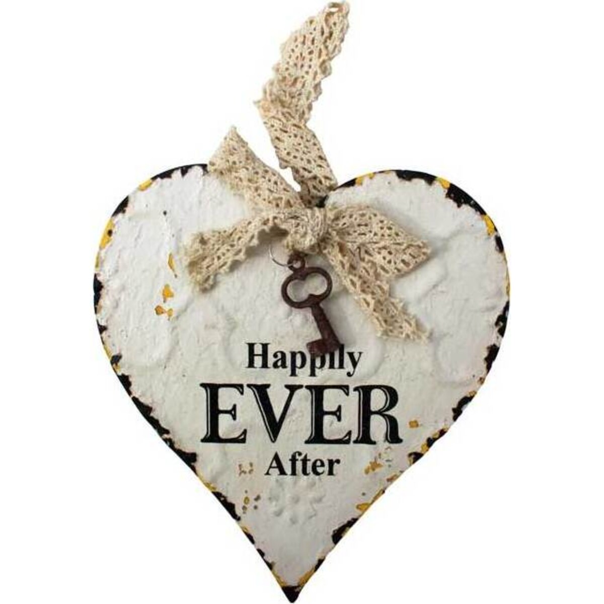 This white heart features the words "Happily Ever After" in black along with a tan lace bow at the top and a tiny antique-inspired key hanging below it. The edges are grazed with black and yellow to give it a beautiful contrast to the light background. While this item is gorgeous enough to hang in your home, it's also ideal to give as a gift to a couple for almost any occasion from a wedding to an anniversary, and even to give out at a wedding as party favours. With an item this lovely, you'll look for any excuse to use it.