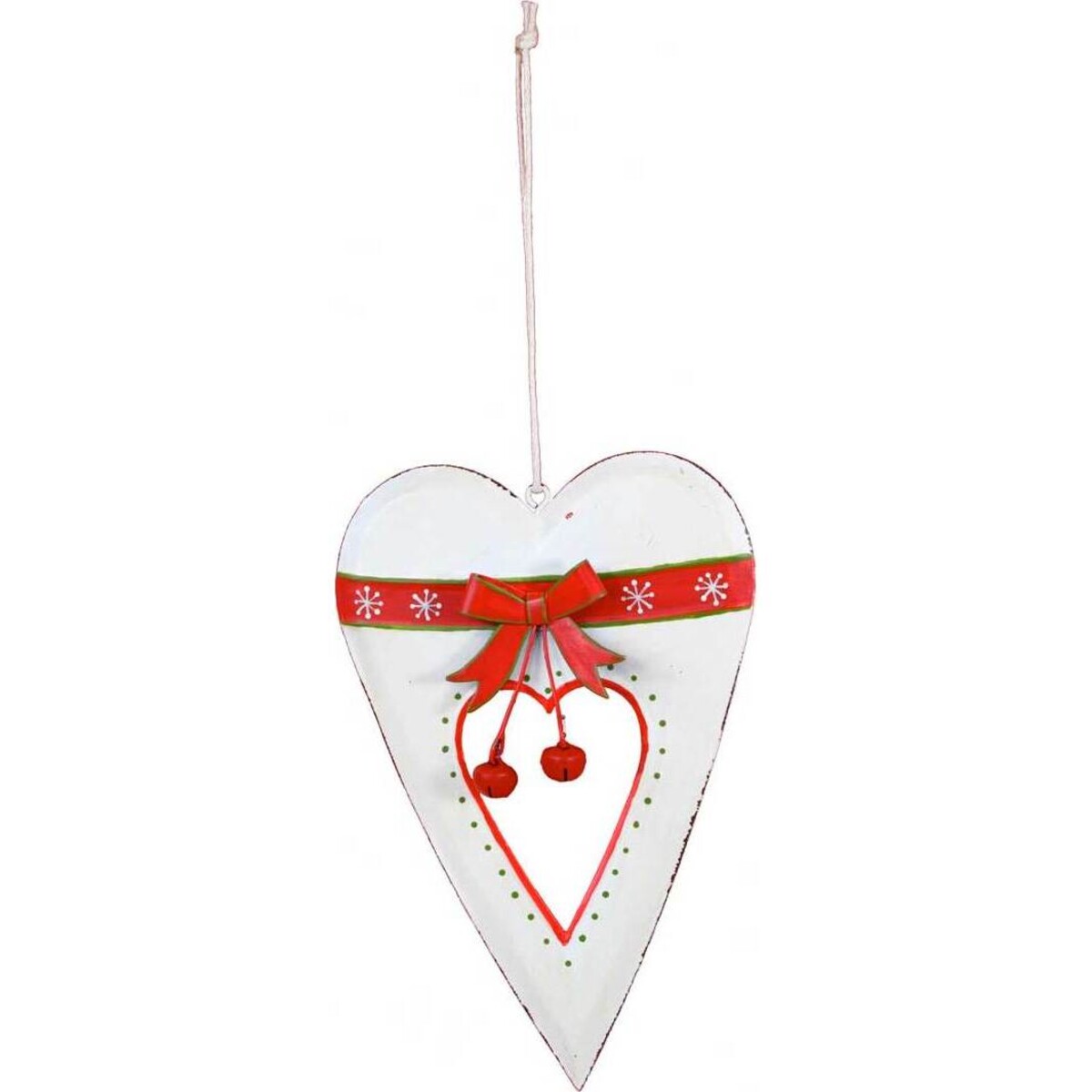 This Festive Bow Hanging Heart from Lavida is going to be your new favourite piece of heart-themed d_cor in your home. The white heart features the image of a red and white horizontal ribbon across the top along with a red bow, a cutout heart at the center with a red border along the edge, and little red bells hanging within. The edges are darkened to give it contrast. A thin white ribbon tied in a loop at the top allows for easy hanging wherever you decide to display it.