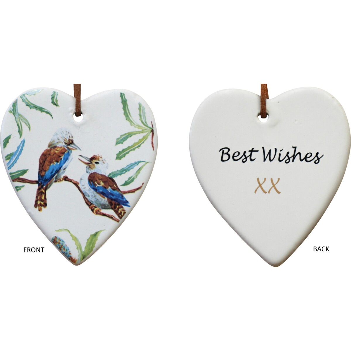 Made from fine quality ceramic, this creamy white heat has been lovingly handcrafted. The sheen of fine ceramic makes this such a delightful piece. One side of the piece has been adorned with a nature-based print in bright and natural colours of foliage and two kookaburras make it look all the more interesting. The other side has the printed words in fine gold colour-Best Wishes printed in a flourishing scroll- adds to its utterly charming look-after all, tiny gifts do go a long way in communicating deep and complex emotions in simplest possible way. Made of super smooth quality ceramic, this tiny little hangable heart makes for a impressive tiny gift that anyone would be pleased to receive. After things that carry pure and honest love seldom need too much fanfare to prove their worth and hence this tiny gift is all that will take to convey your warmest good wishes.