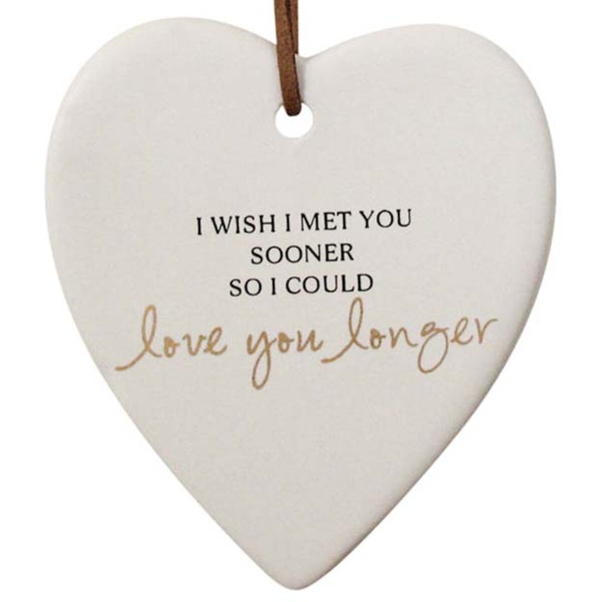 Presenting the Hanging Heart Love Longer, an exquisite, handcrafted ceramic piece that adds a touch of heartfelt sentiment to any setting. At 8x9cm with an added hanger, this charming keepsake is the perfect size for a cozy nook, an inspirational office space, or a personal corner of your home. The unique heart shape and endearing message, "I wish I met you sooner so I could love you longer," resonate with anyone who has experienced the sweetness of timeless affection, making it a universally appealing gift.