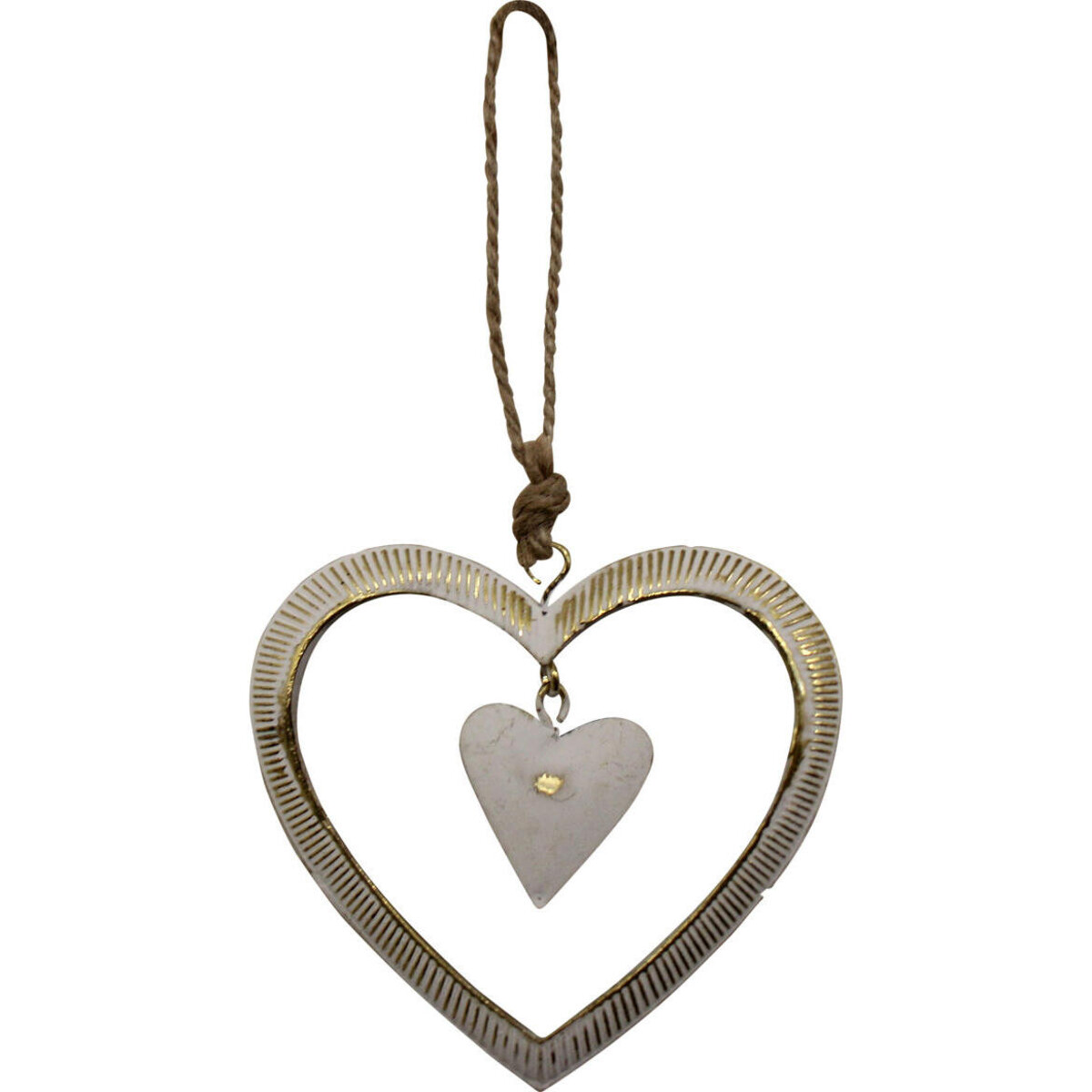 Delight your interiors with the presence of hearts with this simple but enduringly beautiful handcrafted piece that combines the shabby chic vintage design with a modern kind of twist. It is made of metal in silver tone with just the outer ring present while in the middle of it is a tiny trinket like plain metal heart. The outer rim of the heart shaped hangable accent is all white and gold in colour with thin ridges as its main pattern. The touch of golden colour lends it a beautiful ornate feel while the white adds to its vintage charm. It comes with an hangable provision that will help you place it anywhere in ned of a cheery presence. The height of the piece is 8 cm while its width is a mere 7.5 cm. The burlap twine with which it is suspended adds to its obvious charm - very rustic yet ornate in its own way.