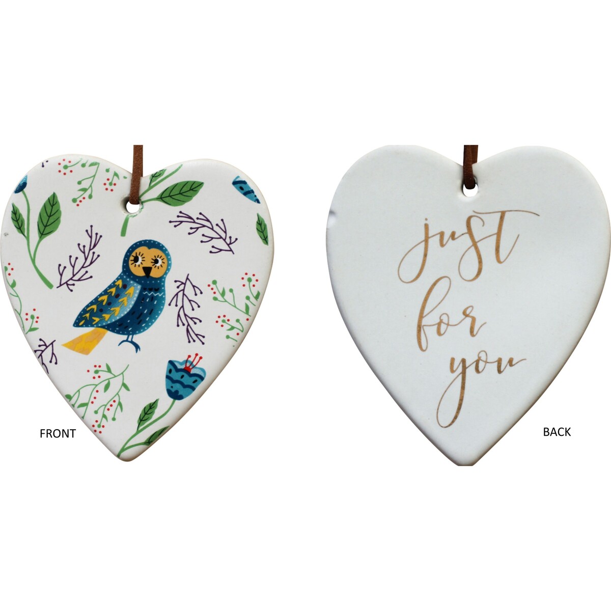 When adorable little owls adorn adorable little hearts, you get the most adorable variety of gift. Crafted by hand using ceramic that has been given the smoothest texture. This tiny little heart has all those built in imperfections that all handmade article possess-as no two would ever be the same., casted in moulds and finished by hand, these little hearts carry a loving message that makes it such a tender little gift to give to someone you love and care for. The ribbon slotted through the top gives it a hangable feature that makes it most versatile in its usage. Give it away like any other gift or simply place it in your own space for that cheery effect that owls bring with them. The symbol of wisdom and good luck, the owl sits on one of the sides while the other side of the tiny heart simply says-Just For You -an endearing little giftable article sure to win you back someone's heart.