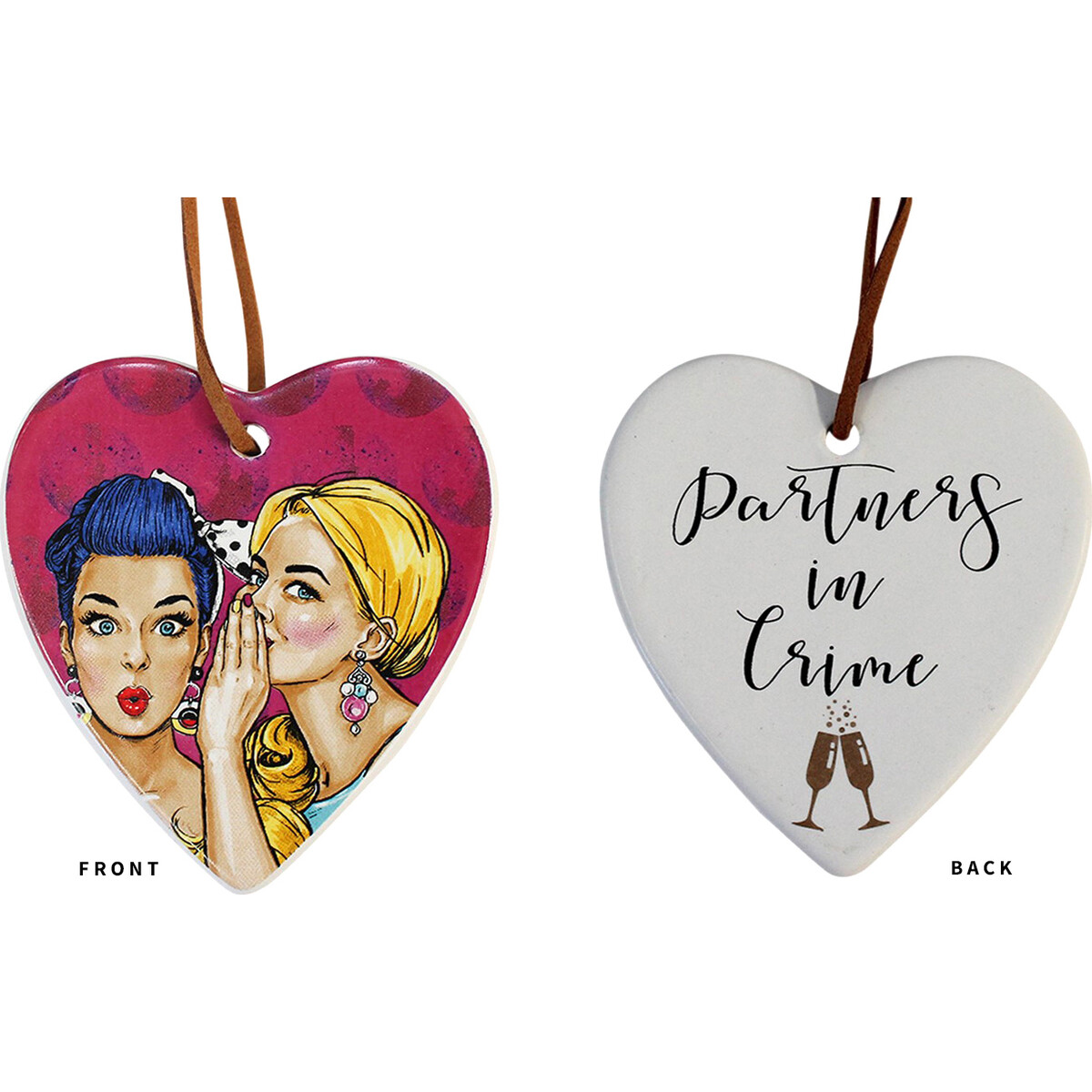 Hanging Heart Partners Crime Secrets is a lovingly designed heart for that awesome friend who adds colours and delights to one's life. Each of these ceramic hearts is unique, custom made for that one friend who totally gets you. This gorgeous heart is hand-painted, and the design is a stunning artwork print of partner in crime who shares the same kind of humour.