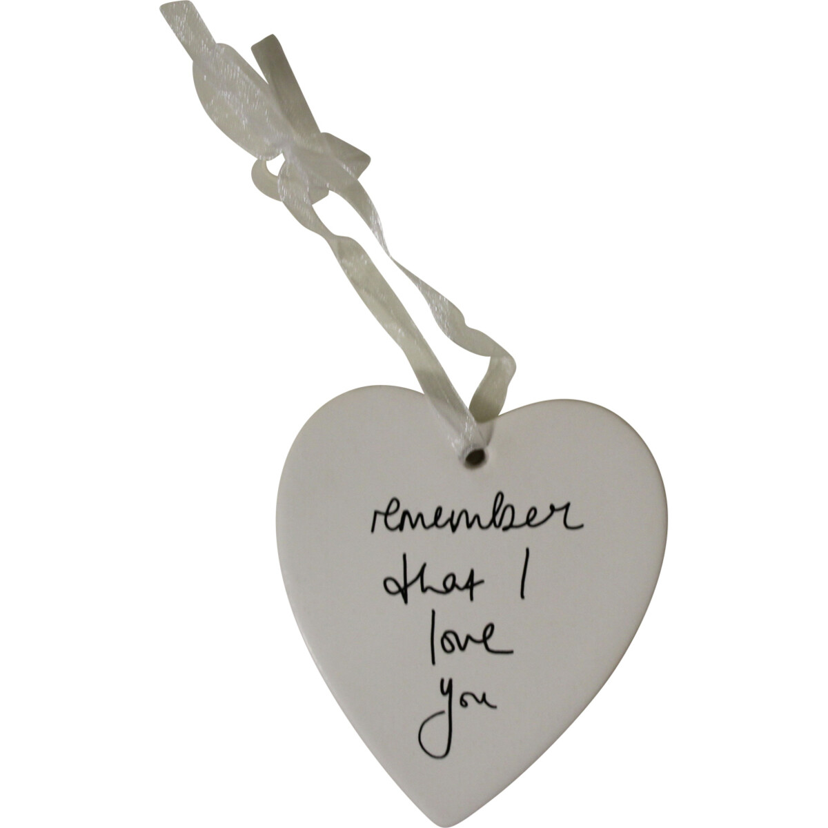 Beautifully handcrafted in a lovely, heart shaped design; the Hanging Heart Remember is one irresistibly charming decorative ceramic item which you should order as many cartons as you can while it is still in stock. What makes this hanging heart décor particularly appealing is not just its symbolic love shapeliness, but also its white themed background and the black stylised endearing words written over the surface of the ornament. Written on it are the words "remember that I love you" in beautiful lettering. It even comes with a lovely ribbon for easy hanging option.