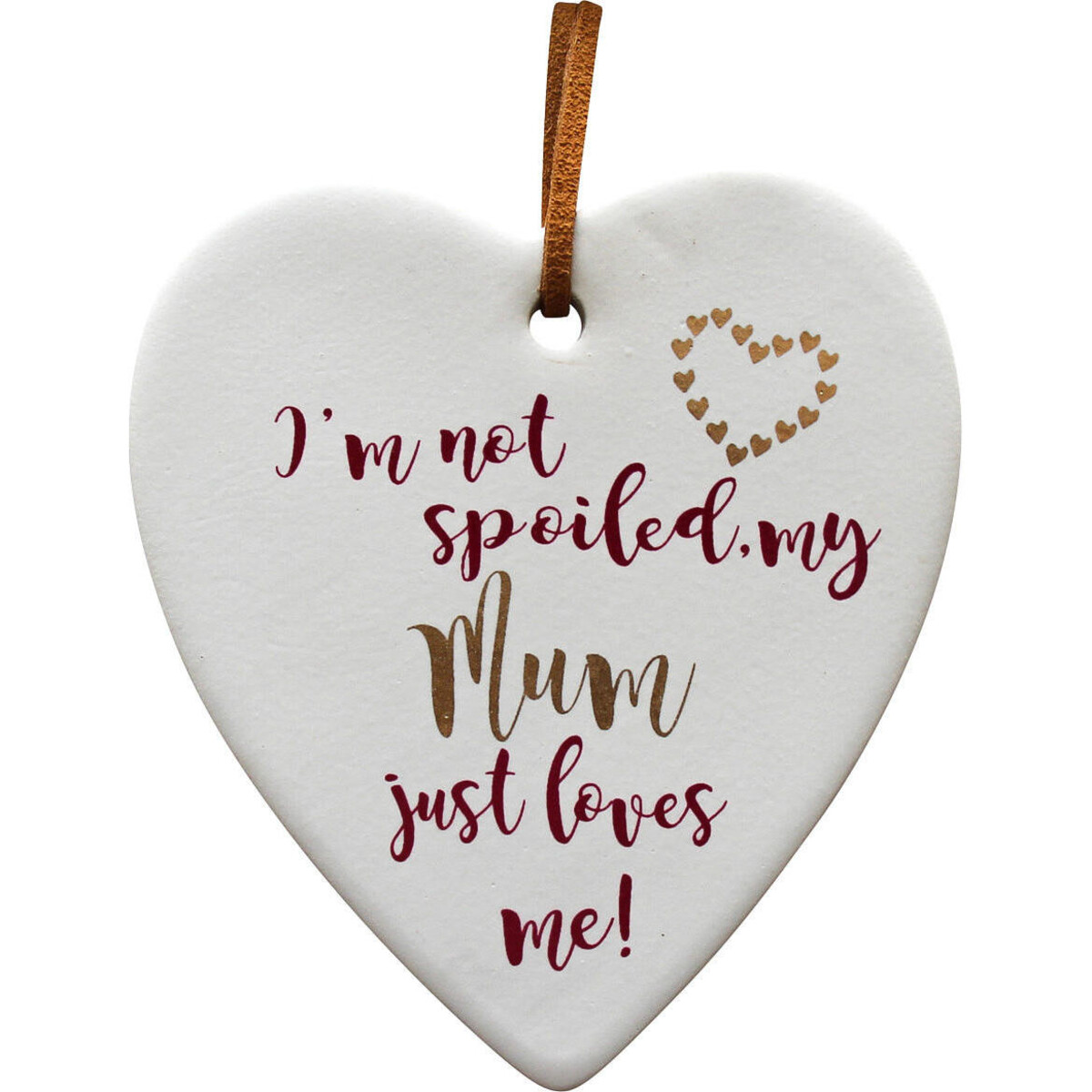 Add some fun and sparkle to your Christmas tree trimmings with this wonderful hanging ornament that comes in attractive typography with a clever quote that reads, "I'm not spoiled. My Mum just loves me!é If you want to show your gratitude to your Mum or mother-in-law for her love or want to see a friend, sibling or anyone that has an over-indulgent mother smile then this ceramic heart is for you! It has a delicate ribbon attached that makes it incredibly easy to hang it where ever you please.