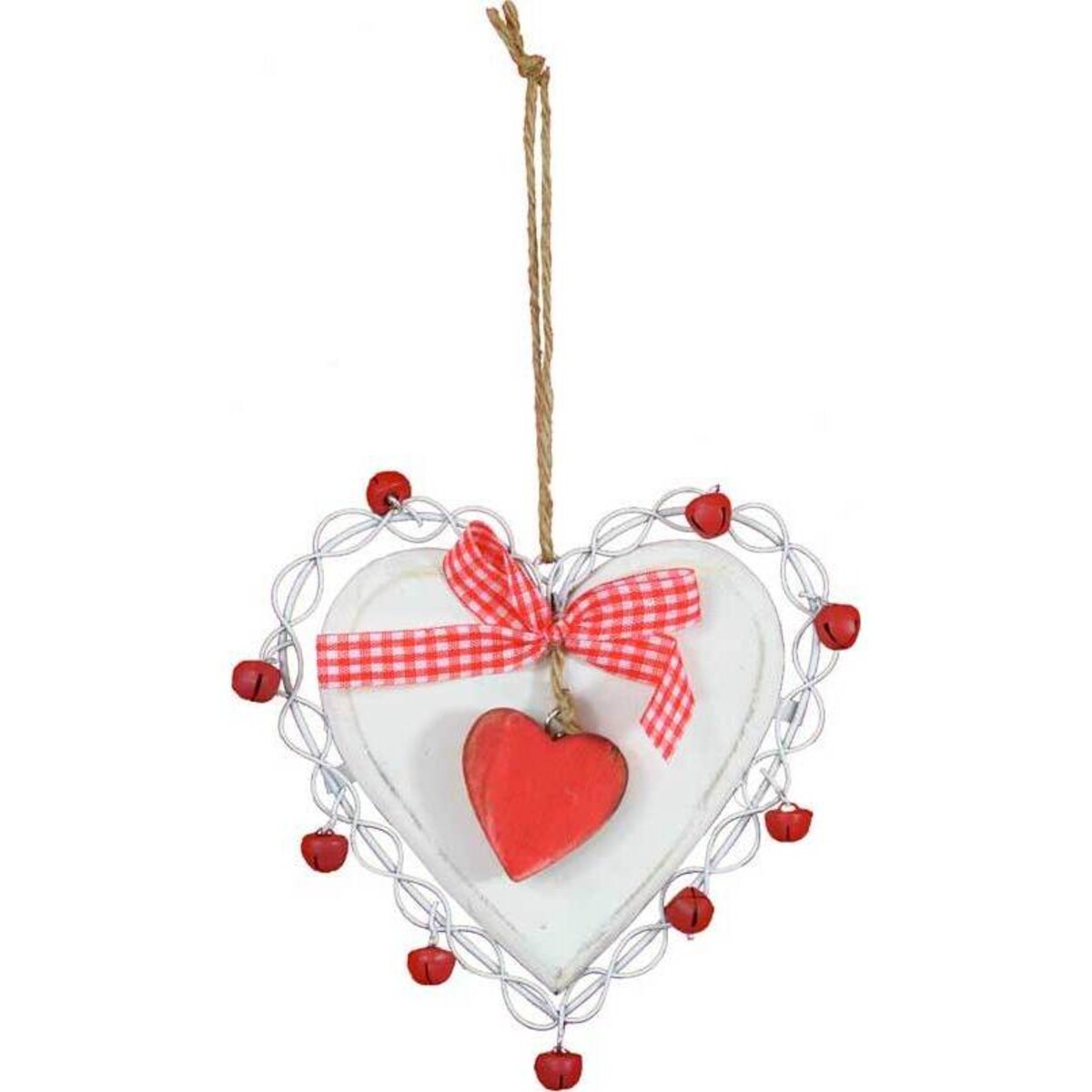 This piece features a white heart as the base with a white filigree border around the edge from which little red bells hang. In the center is a red and white gingham bow and a hanging red wood heart. A tan rope hangs from a loop at the top making this beautiful decorative accent easy to hang from wherever you desire. Thanks to its style and colour, it can complement almost any d_cor. Get one for yourself, but it also makes a lovely gift for a special friend in your life.