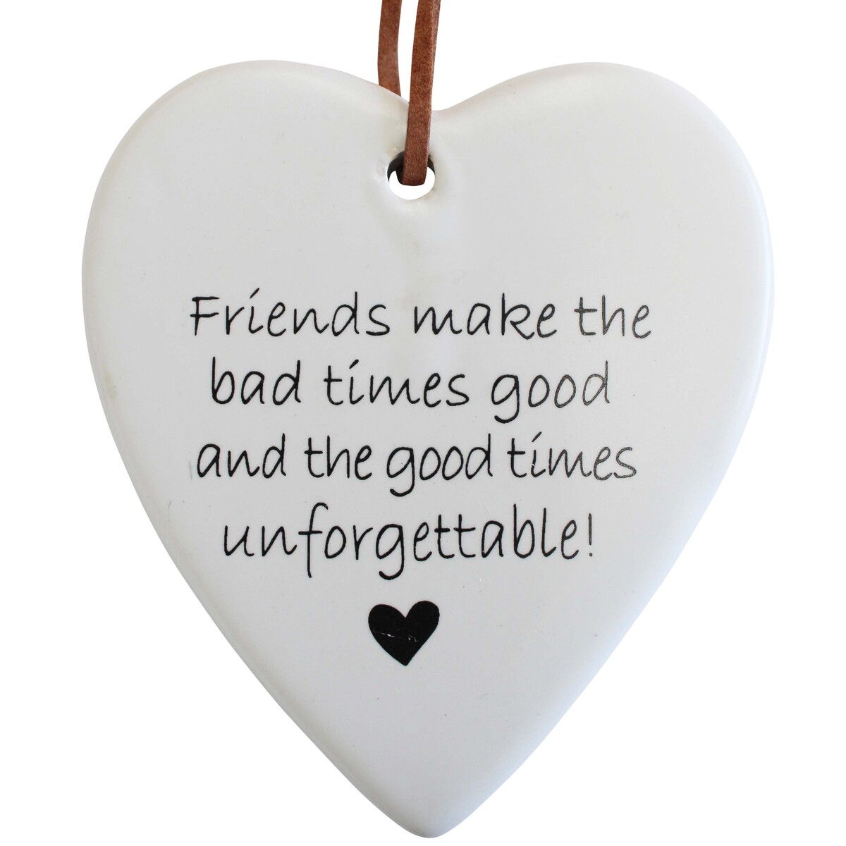 Place this tiny little ceramic heart in any space and feel the love all around for your friends. Made of pottery quality ceramic, it has the words embossed in lovely way in black across its face and is bound to catch all the attention for its lovely looks and the manner in which it can connect with all. Use this as a party favour when you have invited your besties over-or simply add alongside your other such heart collections that could be placed on door knobs, curtains, hung from the window or simply used as tags for baggage or gifts-there are so many ways by which we could include such lovely messages that place that smile on your friends more firmly. The ceramic heart is all of 9 cm tall and 8 cm wide and looks very chic and vintage in its appeal. Its words will remain looking bold and bright even after having it for years. Gift it to make it part of your space-whichever way - anyone would be glad to read the warm and emotion laden sentiment placed on it.