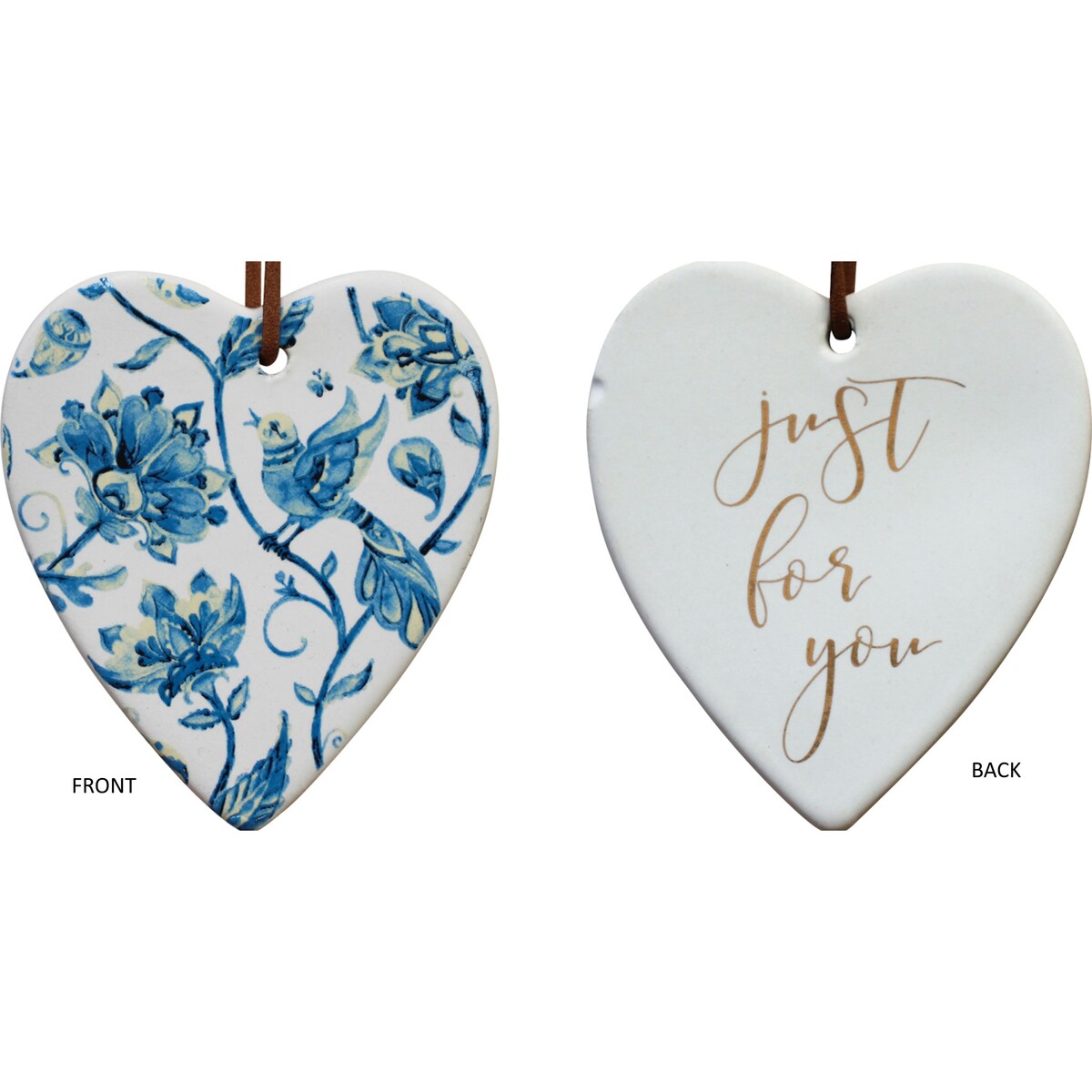 It is enhanced with a lovely blue flowery pattern that features a rather inconspicuous bluebird. The birds have a perfect blend with the background. The aesthetic value of this design illustrates a mix of a blue and cream awe-inspiring flower that cascades over the heart for a vintage look. Turning rearview captivates one's attention with its metallic gold writing, "Just for you." It has a brown leather ribbon that gives it the quality of being hanged on walls, trees, and doorknobs, thus breathing warmth and life wherever it is placed. Its ceramic material is not a disadvantage to easy break but rather an addition to its grease resistance quality. With a simple scrub, there's a guarantee of quick recovery from stains.
