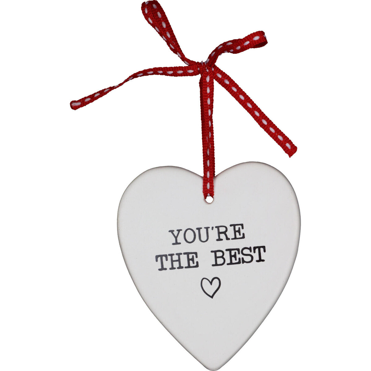 A pretty little ceramic heart with words that truly comes as if straight from there - it says - you're the best - the very warmth and sincerity of the compliment goes straight on target. The ceramic heart has been created with great finesse - moulded with perfection and the print sits on the face looking pretty. Could be used for basic décor ornamentation - maybe on gifts or displays meant for anniversaries, celebratory occasions and any such time in your life when love is right on top of the agenda. The heart is 9 cm in height with a maximum width of 8 cm with little slot for the red ribbon that allows it to be hung from any place. Dress up displays or make it count towards adding that touch of love to your Christmas tree as much as any other floral display - it will lend it an attractive kind of accent.