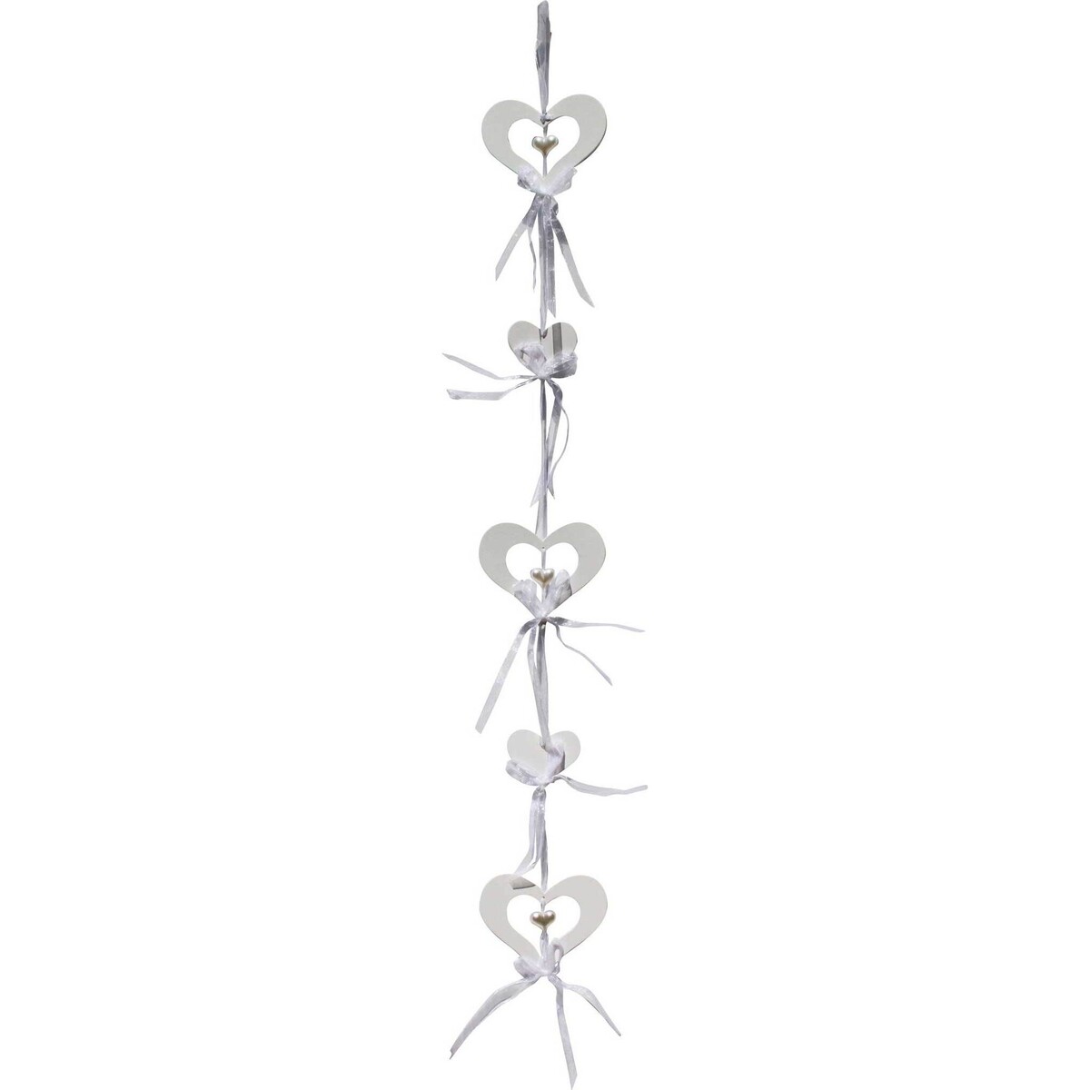 Hanging Hearts Multi White a set of white wooden hearts joined together by a white ribbon and spanning the length of 80cm. Buyers of this item can hang it inside the home within the bedroom, living room or garden when holding special functions. Utilizing a couple of them at an event is a brilliant way of celebrating achievements and infusing a sense of beauty and joy there. The white form of this souvenir offers a reflection of purity and it can be employed with confidence of giving a cheerful occasion that special sparkle regardless of the external circumstances.
