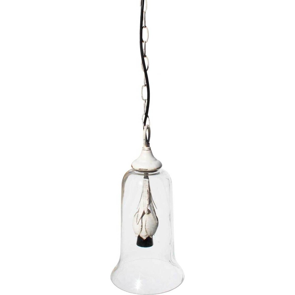 The lovely hanging light with its graceful curved glass shade is fitted with a holder that too shaped like a few petals overlapping beautifully. The flute shaped glass shade adorns the bulb that will be placed in the holder that has this antique kind of detailing. This pendant light could be placed over a seating area, perhaps in pairs or in threes - maybe even as a singular presence - it's about 37 cm in length with major part of its structure made up of a metal chain that holds the hanging shade as it drops gracefully down its length. The clear glass will ensure that the luminosity is right and whatever your choice of wattage, you will surely make the most of its colour and brightness. The combination of glass and the simple definitive presence of metal makes it a classic sort of piece that goes well in industrial modern settings or in shabby chic homes as much as in vintage appeal settings.