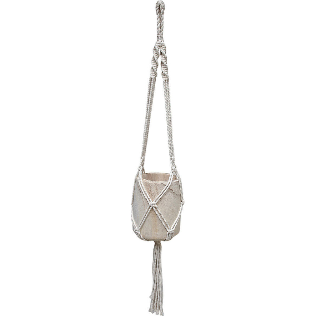 You could place a tiny plant in its wood made bowl. Created from thread alone, the thick rope like hanging harness is what holds the tiny wood made bowl that is cylindrical in shape but smooth and well finished - you could place tin air plant in them or simply add faux flowers or beads and all kinds of handles in it and make it look like spot of cheer in your room or the balcony. The rope made harness will swing and sway in the breeze yet the bowl fitted into it will hold on tight. The macram?É© art work is fascinating in its method and ability to create shapes with rope and thread and bringing this to focus is this beautiful creation. Add that little touch of whimsy to your space sin the form of this macram?É© made pot that simply sways and sits astride this rope that works like a tiny harness. Handcrafted from rope that is soft and easy to knot - the art of macram?É© is ancient - perhaps one of the earliest means by white threads , twines and vines were used to create shapes - and bringing to focus this simple yet fascinating art is this pot sitting astride in the pot itself is made from light wood and will hold a tiny little plant if you so decide to use it. The white rope enhances the simple beauty of the piece while the wood coloured pot too lends it a simple kind of natural beauty.