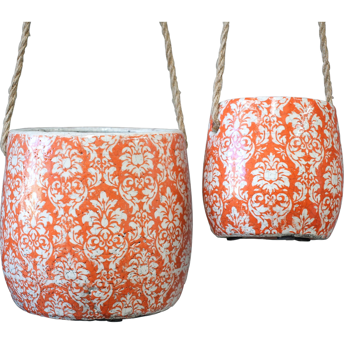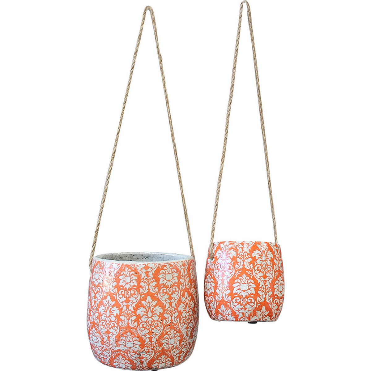Give your potted greens a whole new elevated look with these hangable pots with a gorgeous pattern. The ceramic made planter are sized in small and big sizes that come in a set. The white speckled base is adorned with a gorgeous kind of rich baroque pattern that adds to the already attractive feature of the planters. The subtle dull orange colour looks especially appealing when seen in the context of greens that will be seated in it. The pots are easy to hang - and come with ropes that are to be slotted through the built - on holes along the body of the planter. The ropes are sturdy and will take the weight of the plant and the soil that will be filled in. The triple rope support will ensure better balance even f there is a lot of wind or movement that affects hangable pots generally.